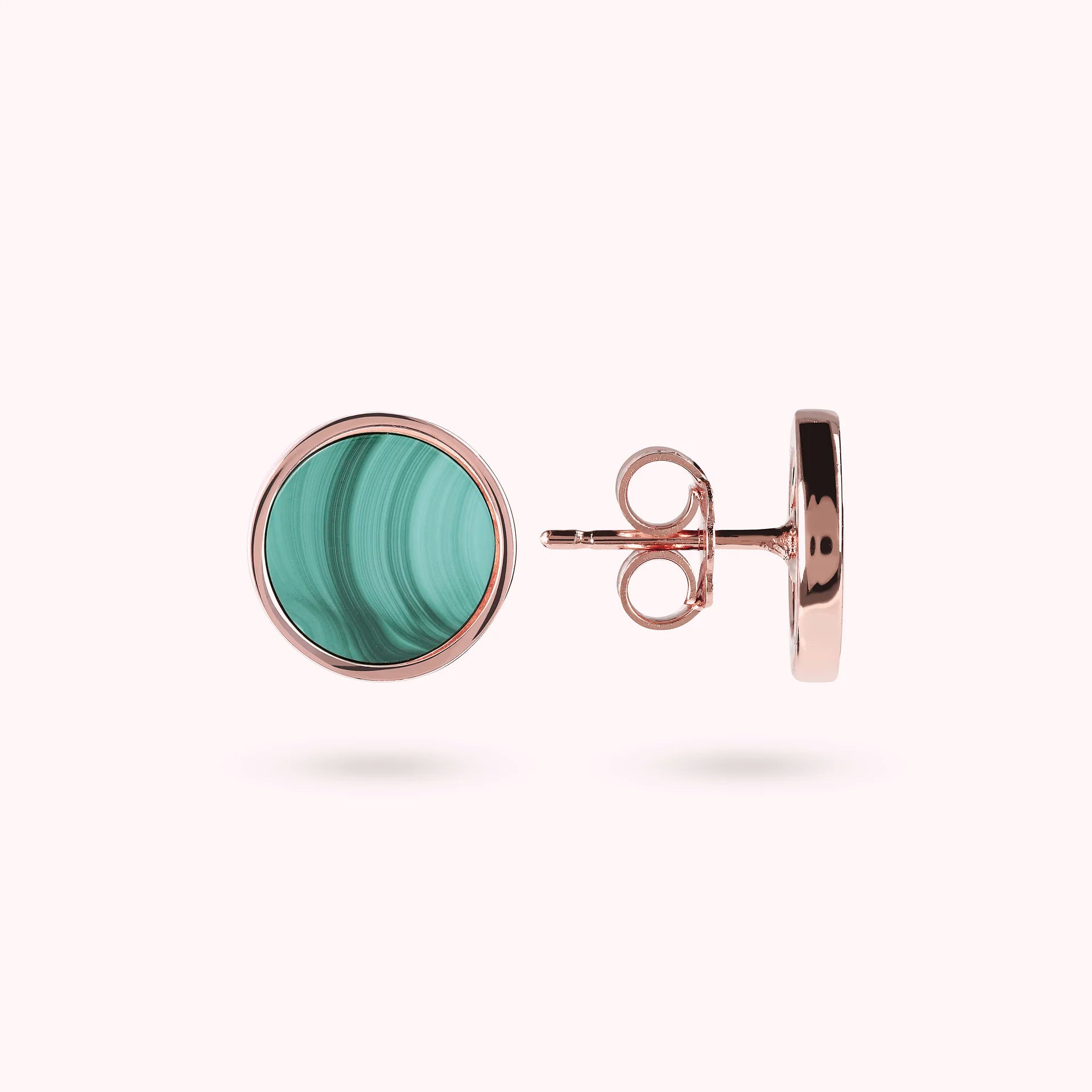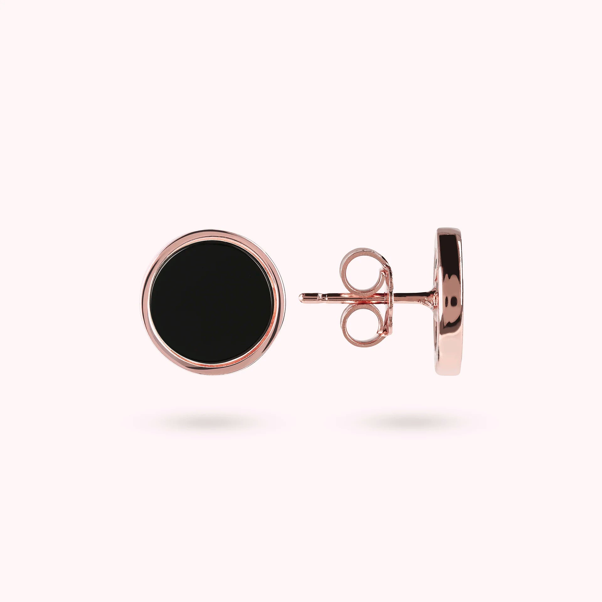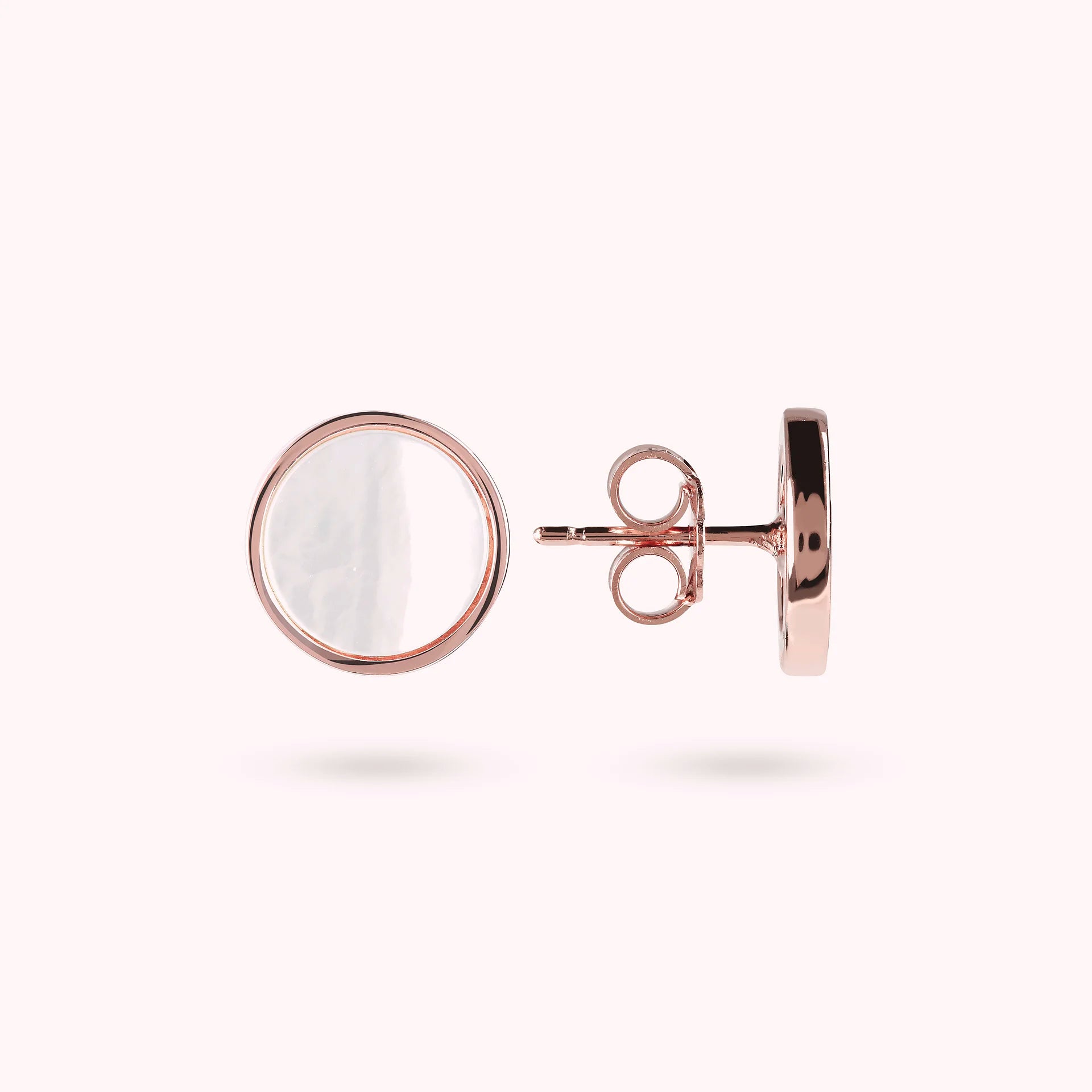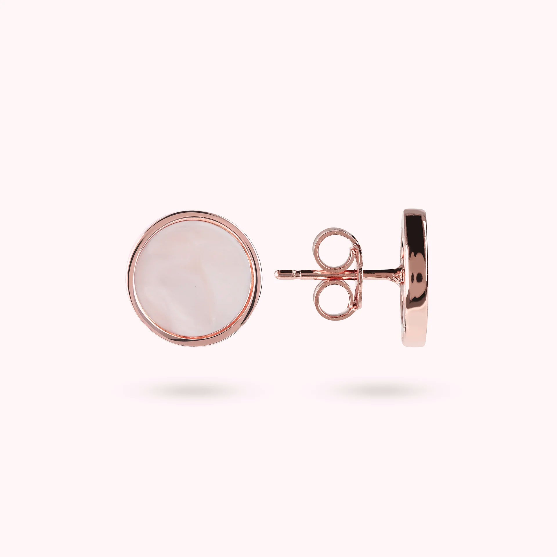 Orecchini a bottone Bronzallure realizzati in lega Golden Rosé, placcati oro rosa 18kt, con disco piccolo (1 cm) in pietra naturale montato su base placcata oro rosa 18kt; chiusura a perno e farfalla.
