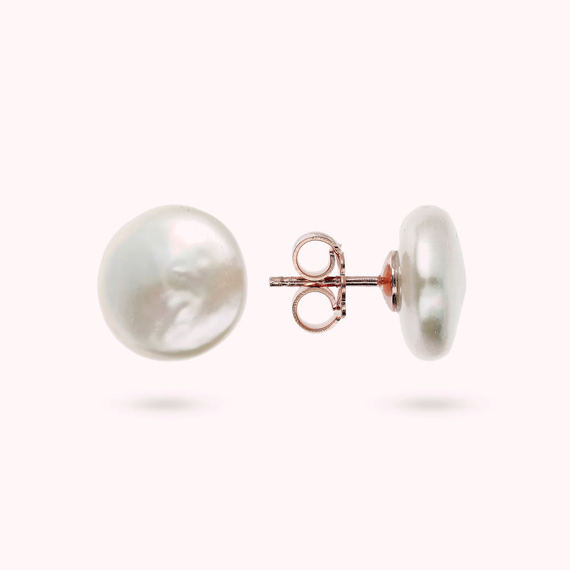 Orecchini a bottone Bronzallure realizzati in lega Golden Rosé, placcati oro rosa 18kt, impreziositi da due perle coltivate d'acqua dolce bianche con diametro di circa 10 mm. Chiusura a perno e farfalla.