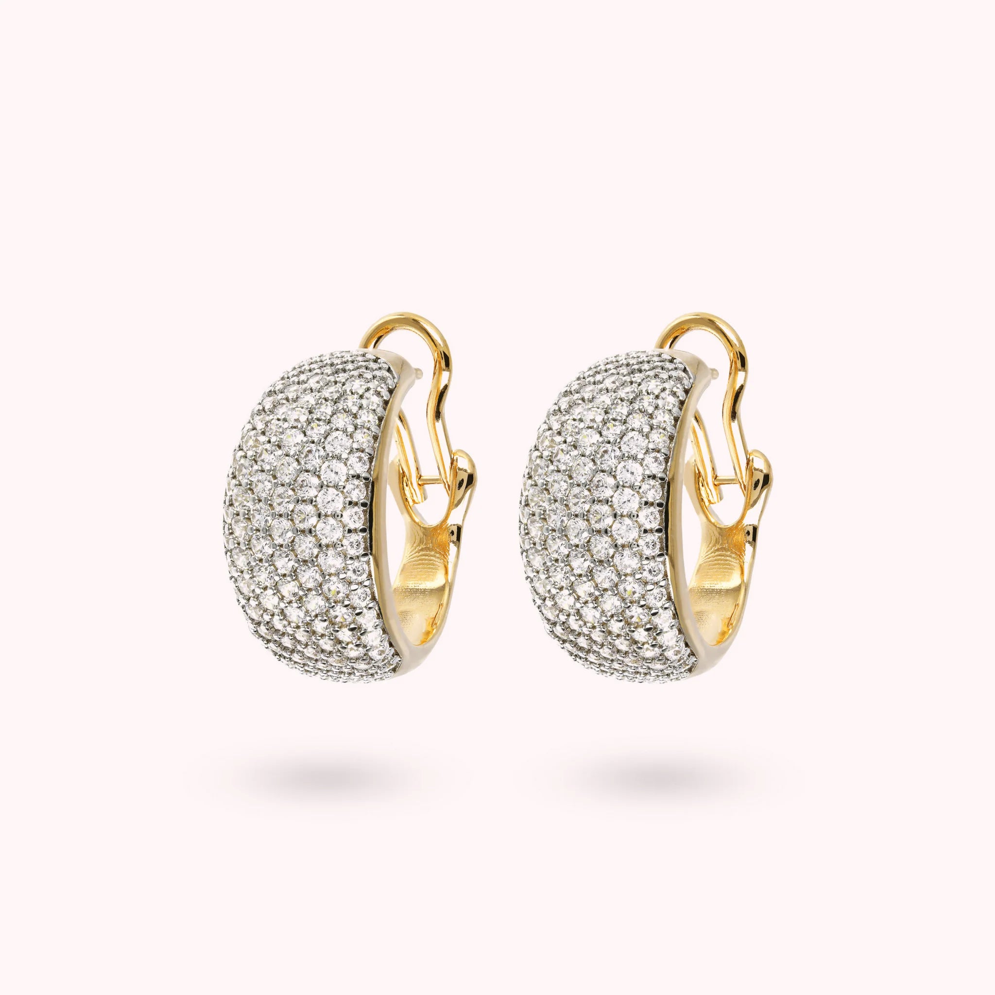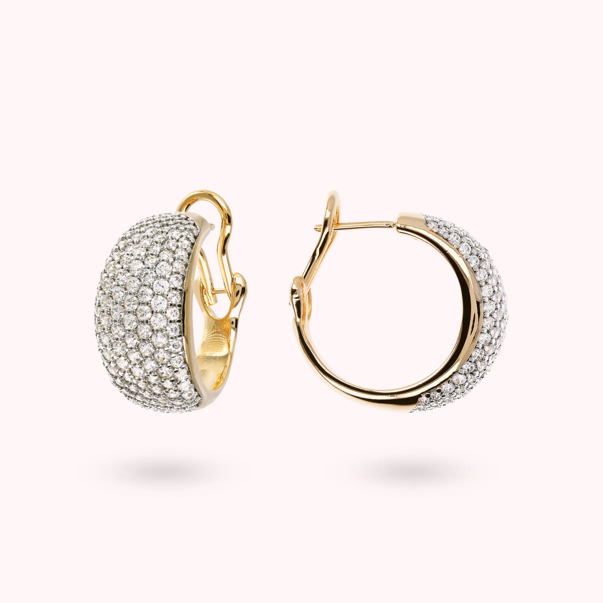 Orecchini a cerchio bombati Bronzallure realizzati in lega Golden Rosé, placcati oro giallo 18kt, con pavé in cubic zirconia luminosi; chiusura a perno e clip. Creazione elegante e perfetta per far brillare il tuo look.
