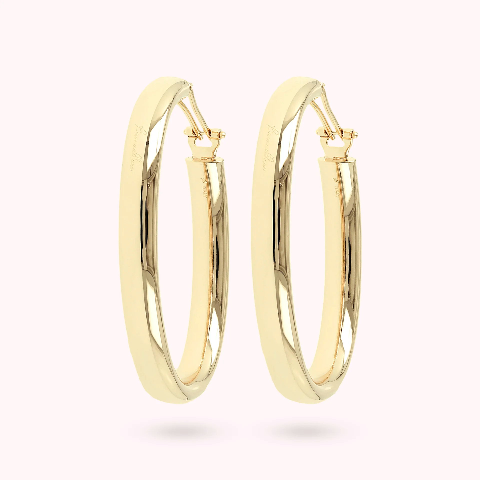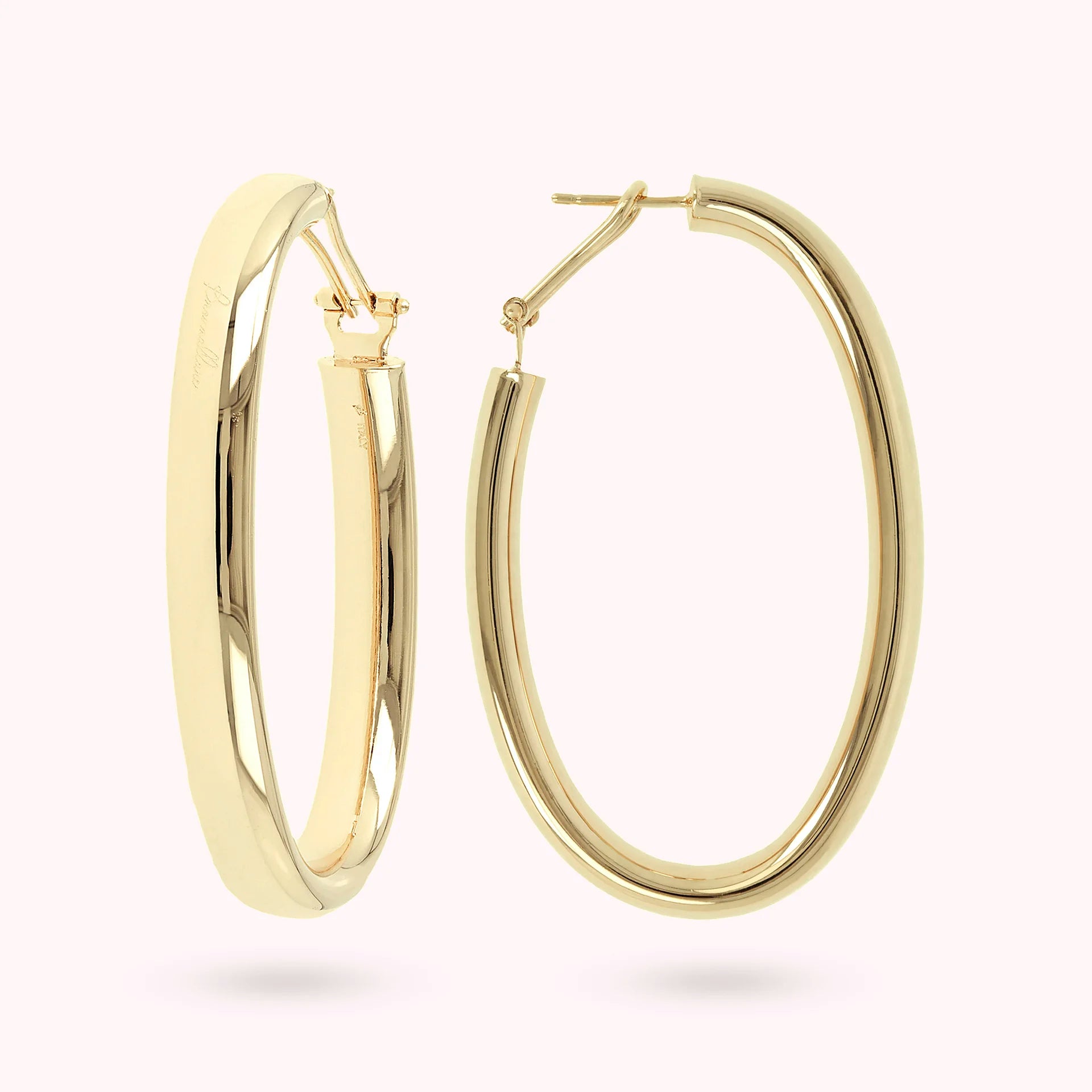 Orecchini a cerchio Bronzallure realizzati in lega Golden Rosé, placcati oro giallo 18kt, dalla forma ovale (30.5x49.5 mm); chiusura a perno e clip. Lunghezza di 4.9 cm.
