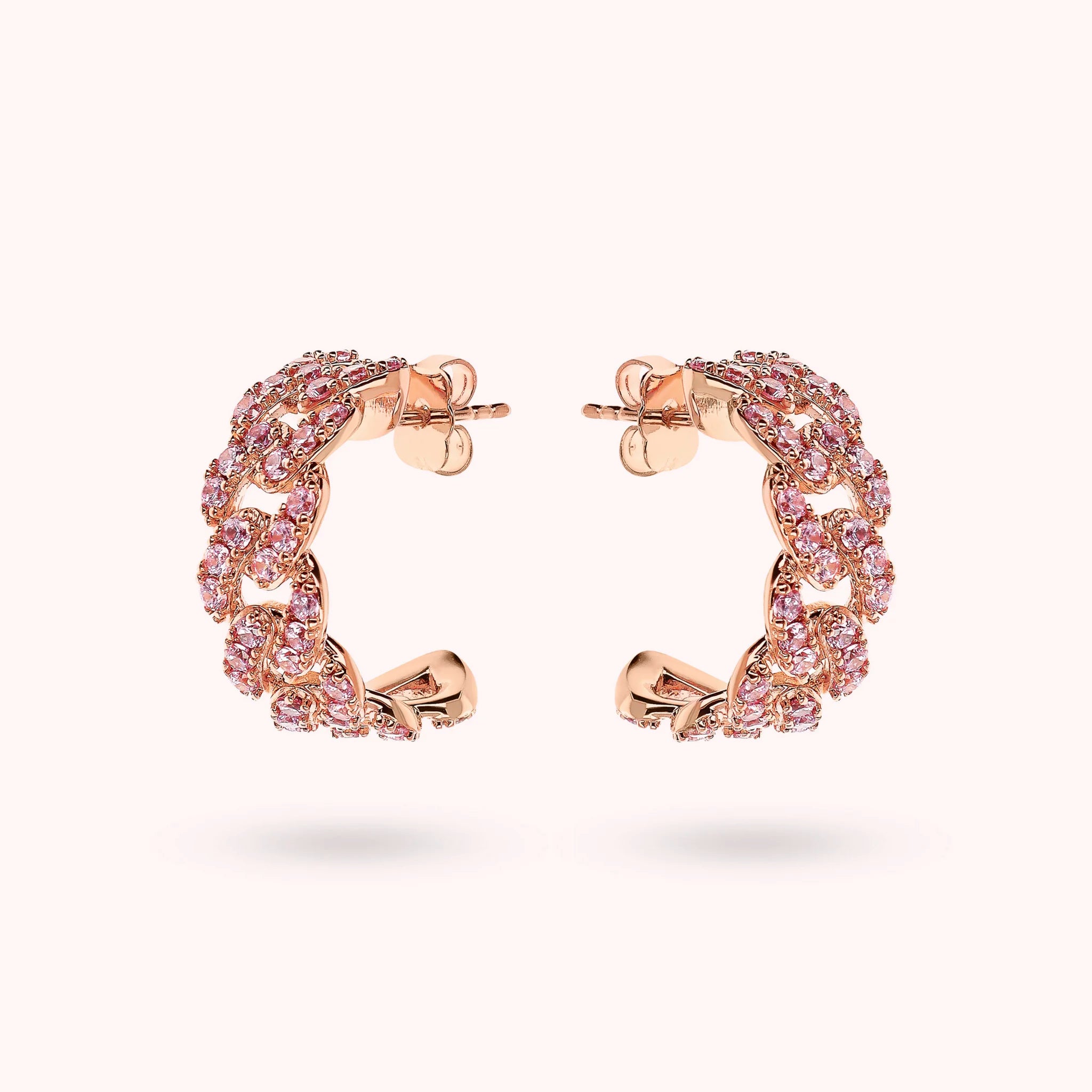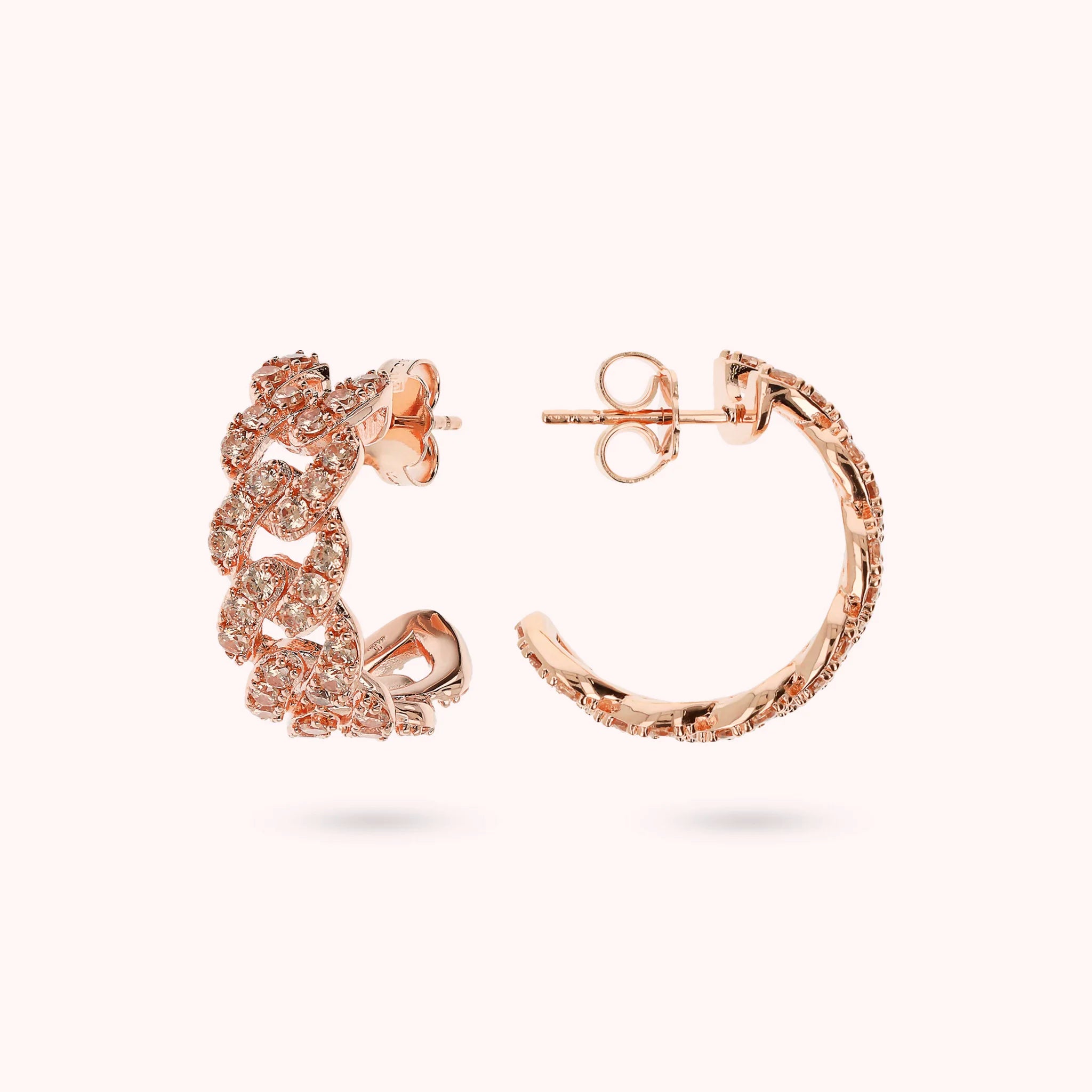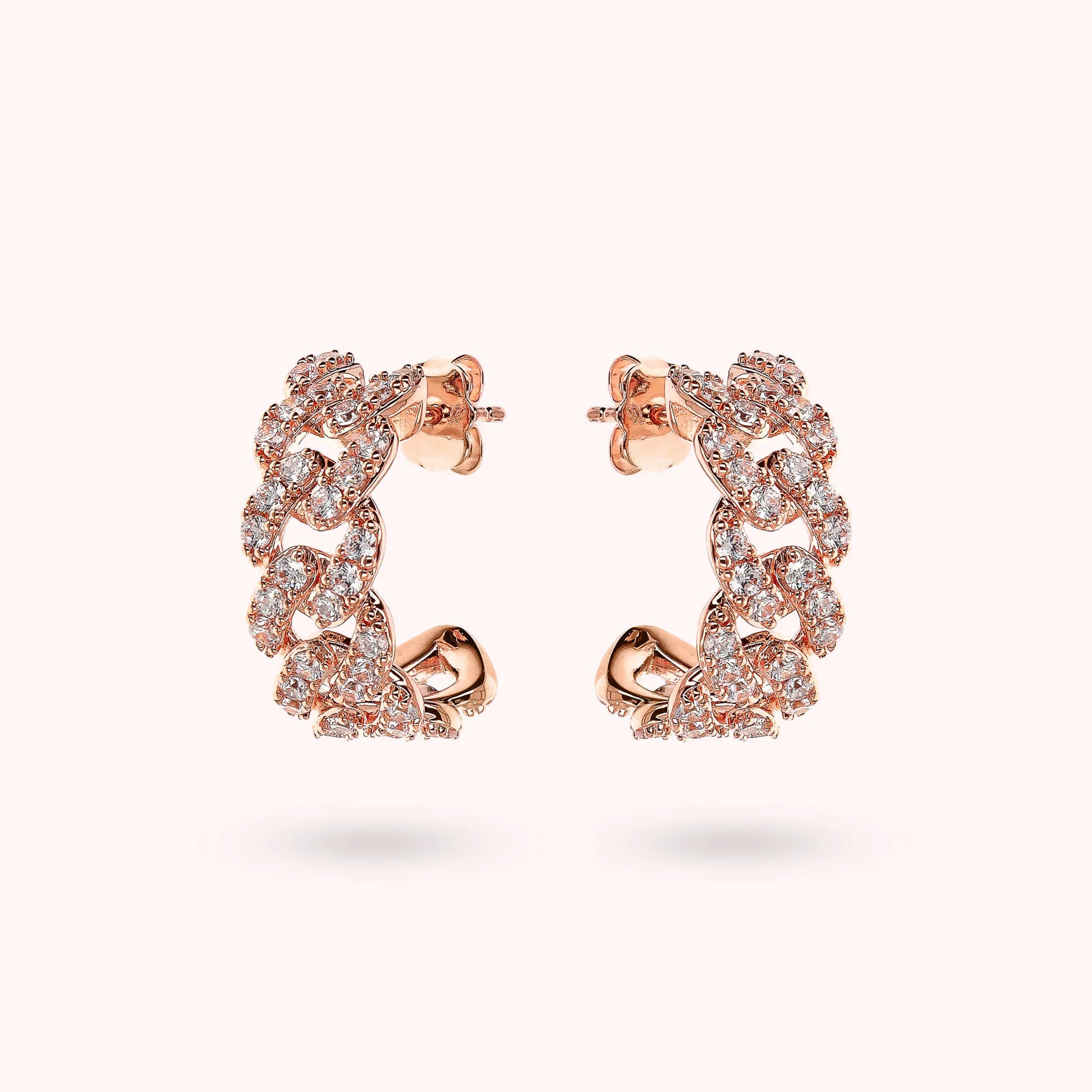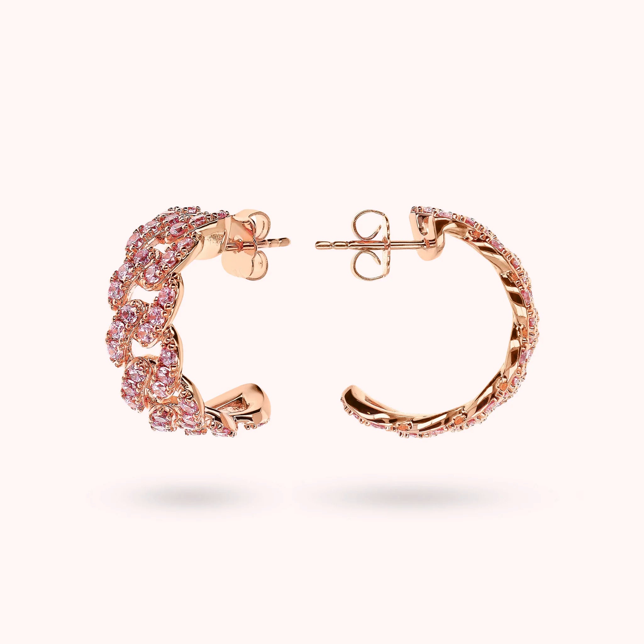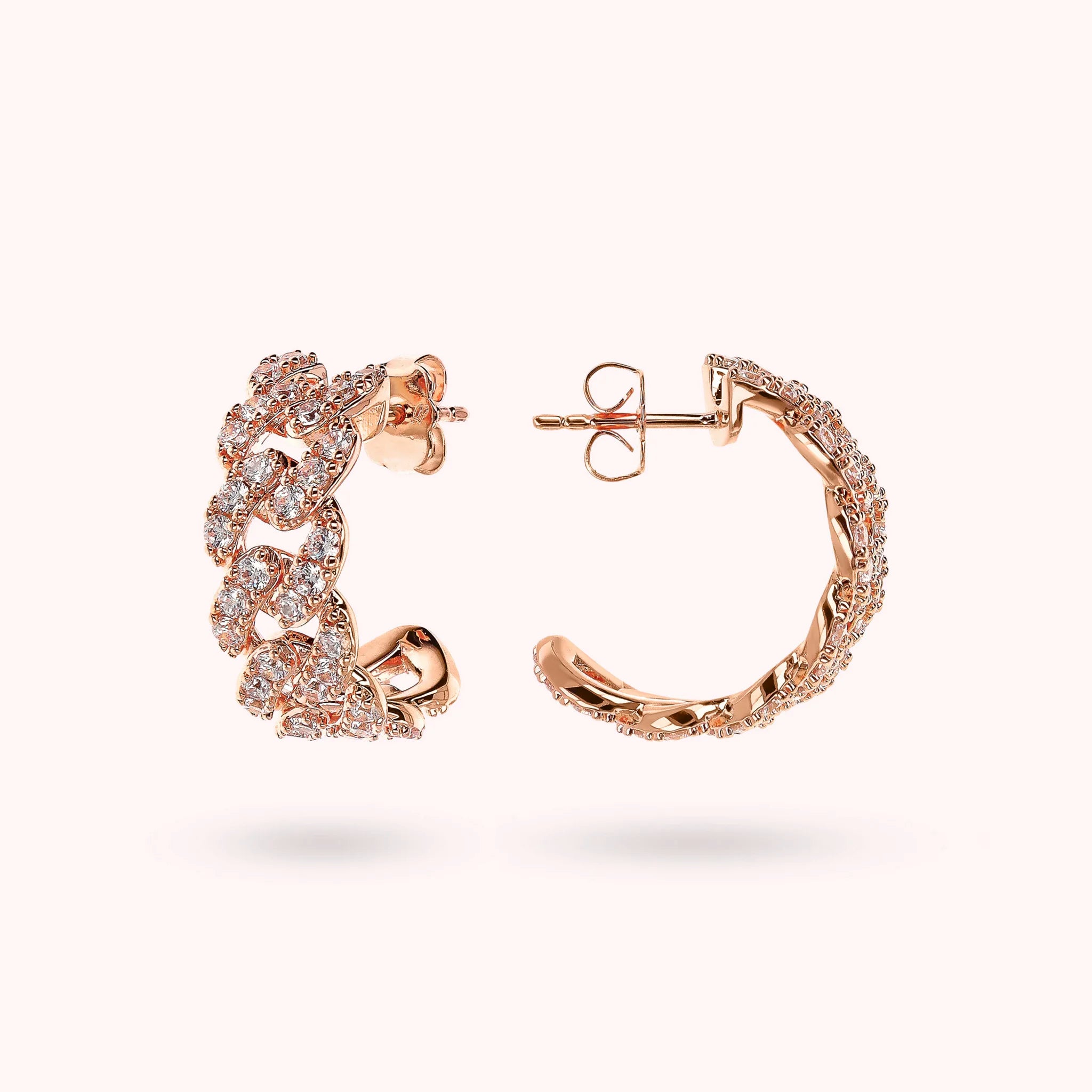 Orecchini a lobo Bronzallure realizzati in lega Golden Rosé, placcata Oro rosa 18kt, con catena grumetta squadrata in pavé di cubic zirconia, qualità luminosa. Lunghezza 2 cm. Chiusura a perno e farfalla.
