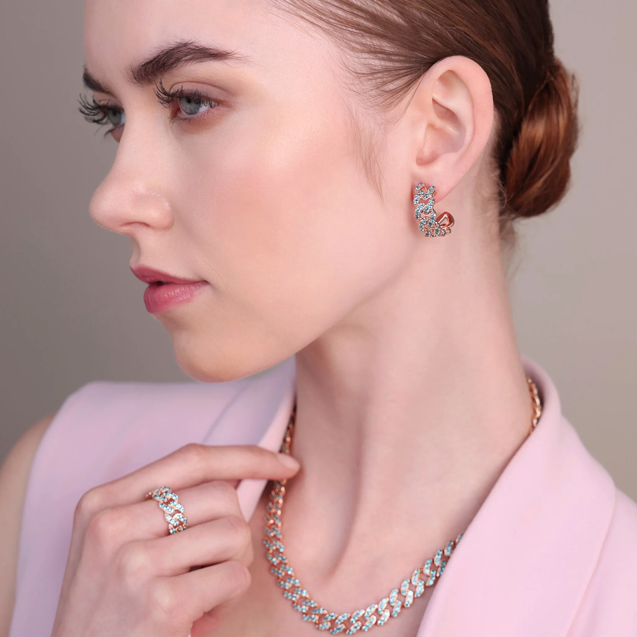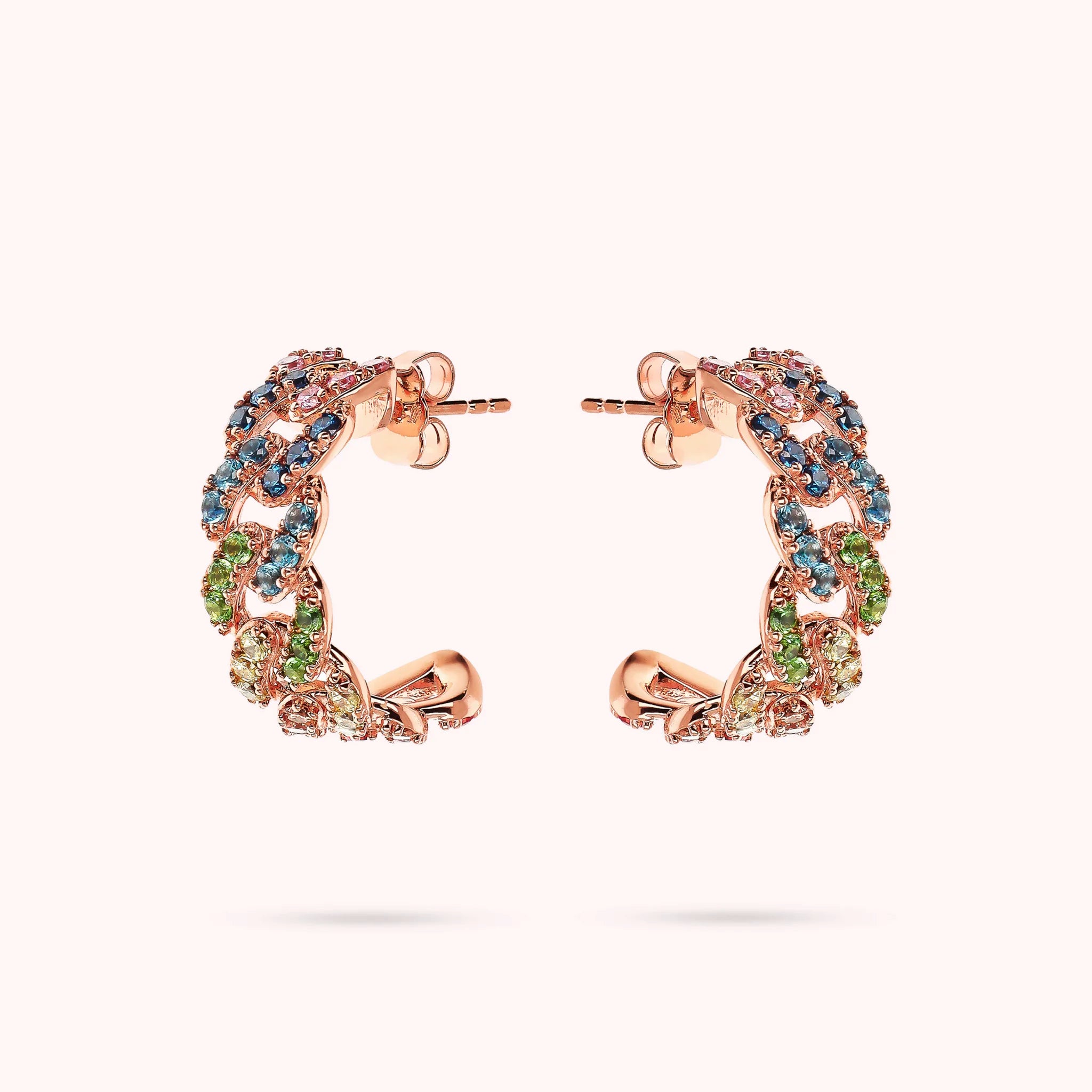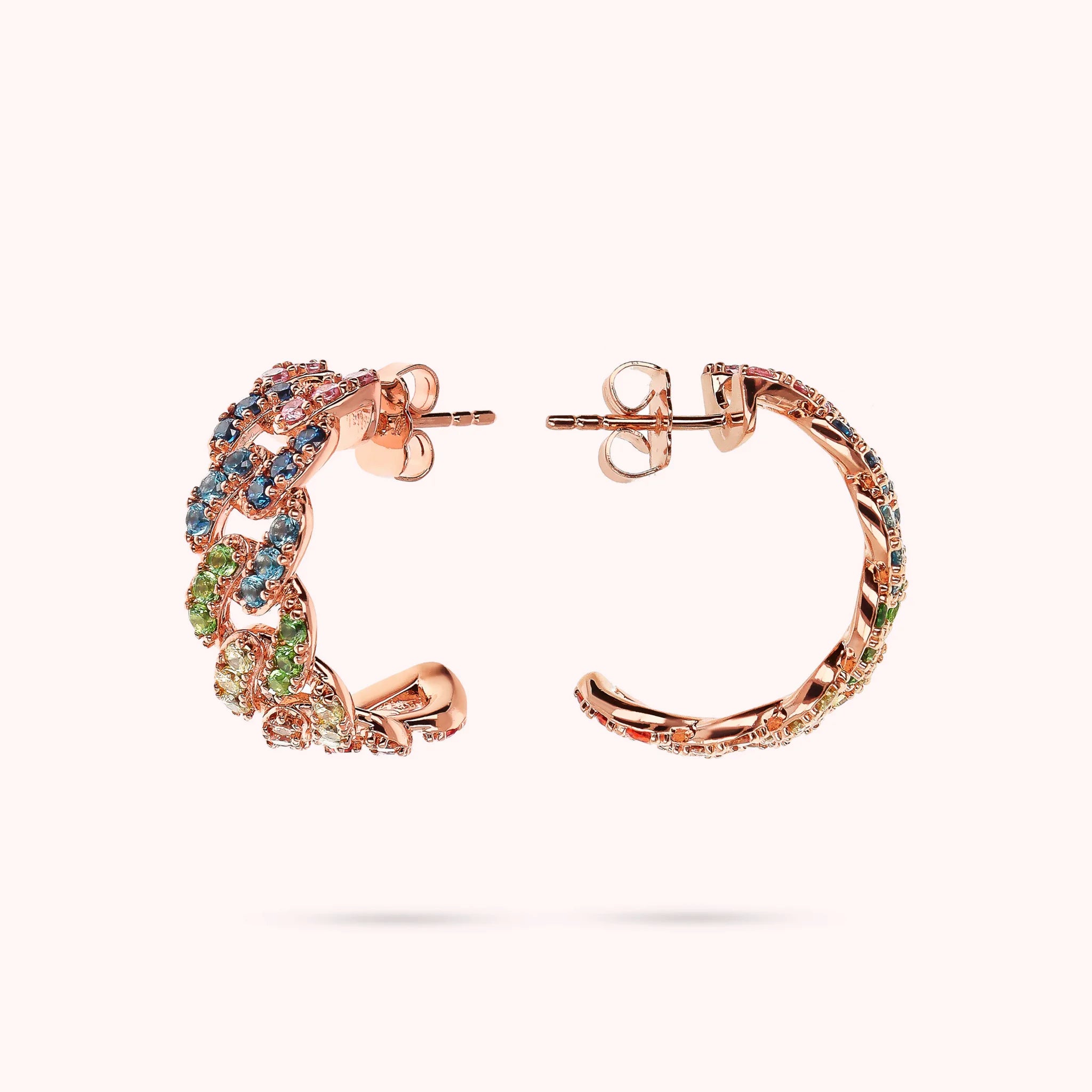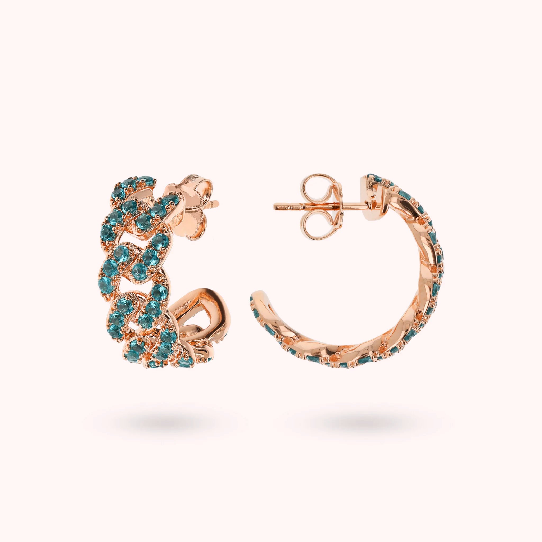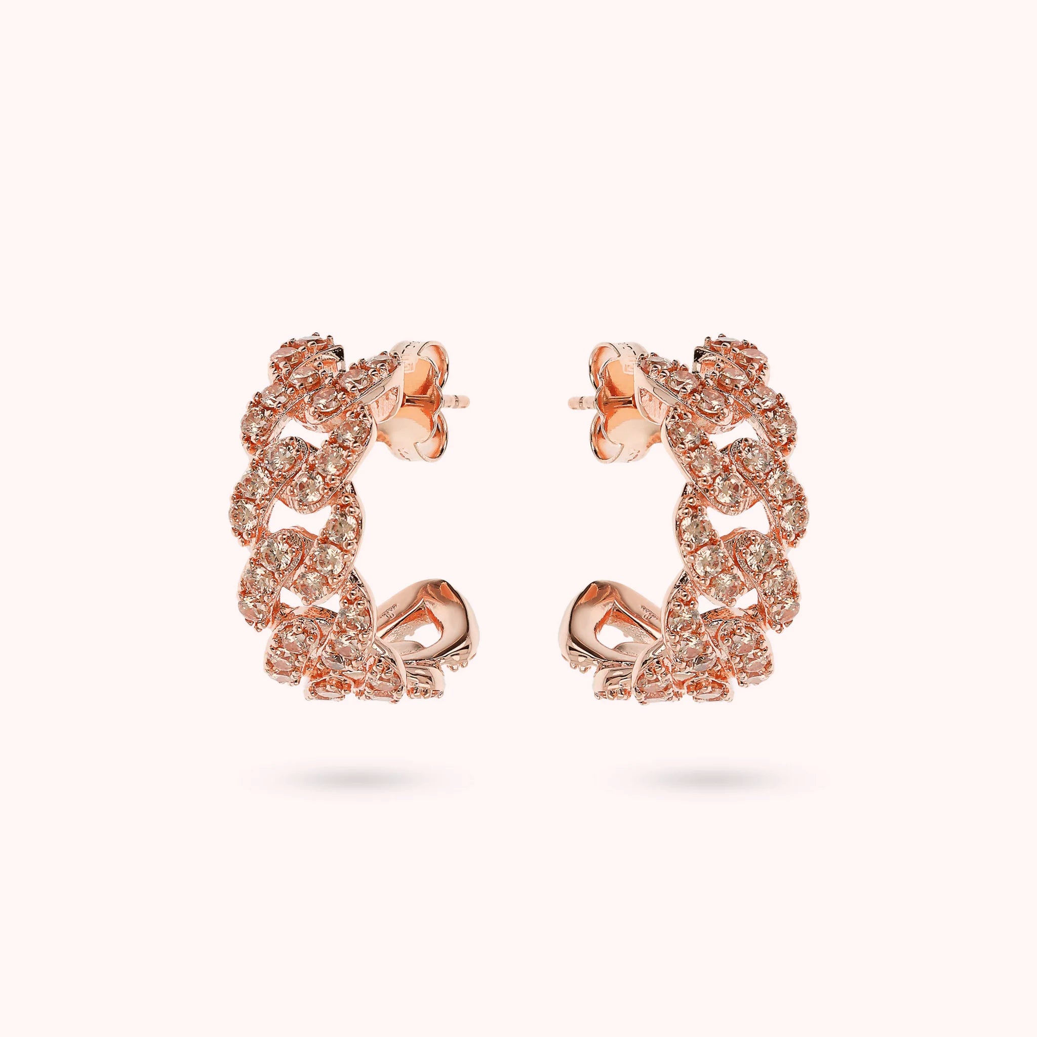 Orecchini a lobo Bronzallure realizzati in lega Golden Rosé, placcata Oro rosa 18kt, con catena grumetta squadrata in pavé di cubic zirconia, qualità luminosa. Lunghezza 2 cm. Chiusura a perno e farfalla.