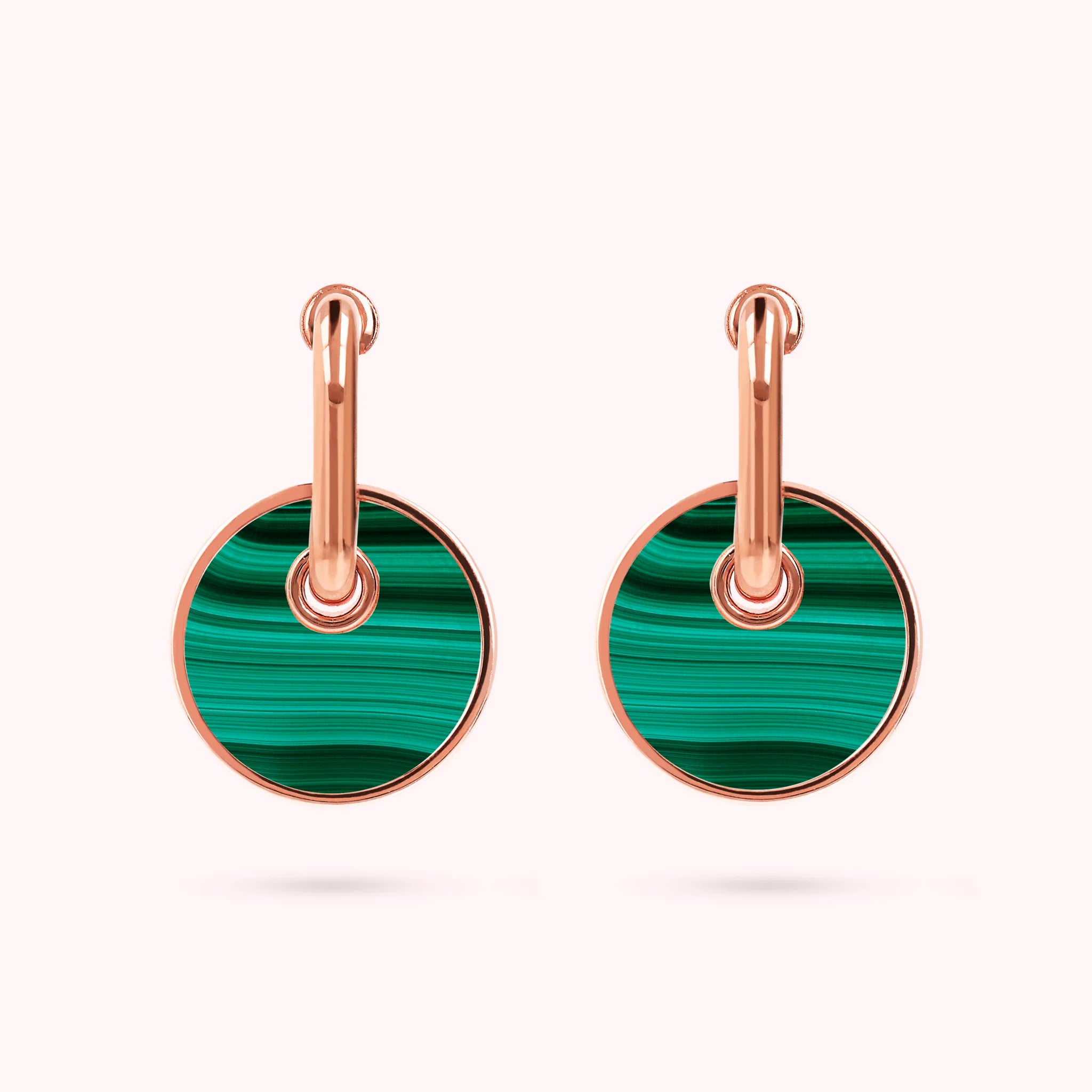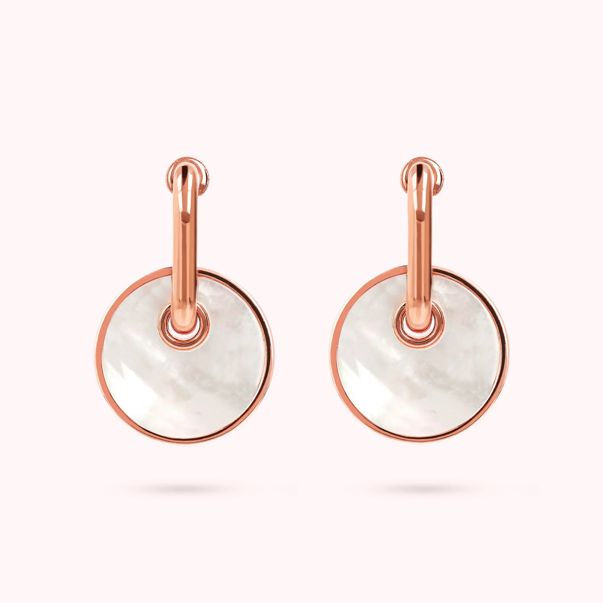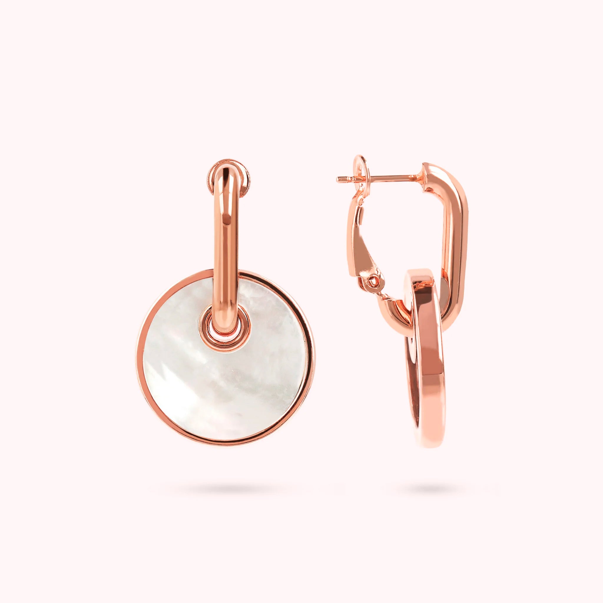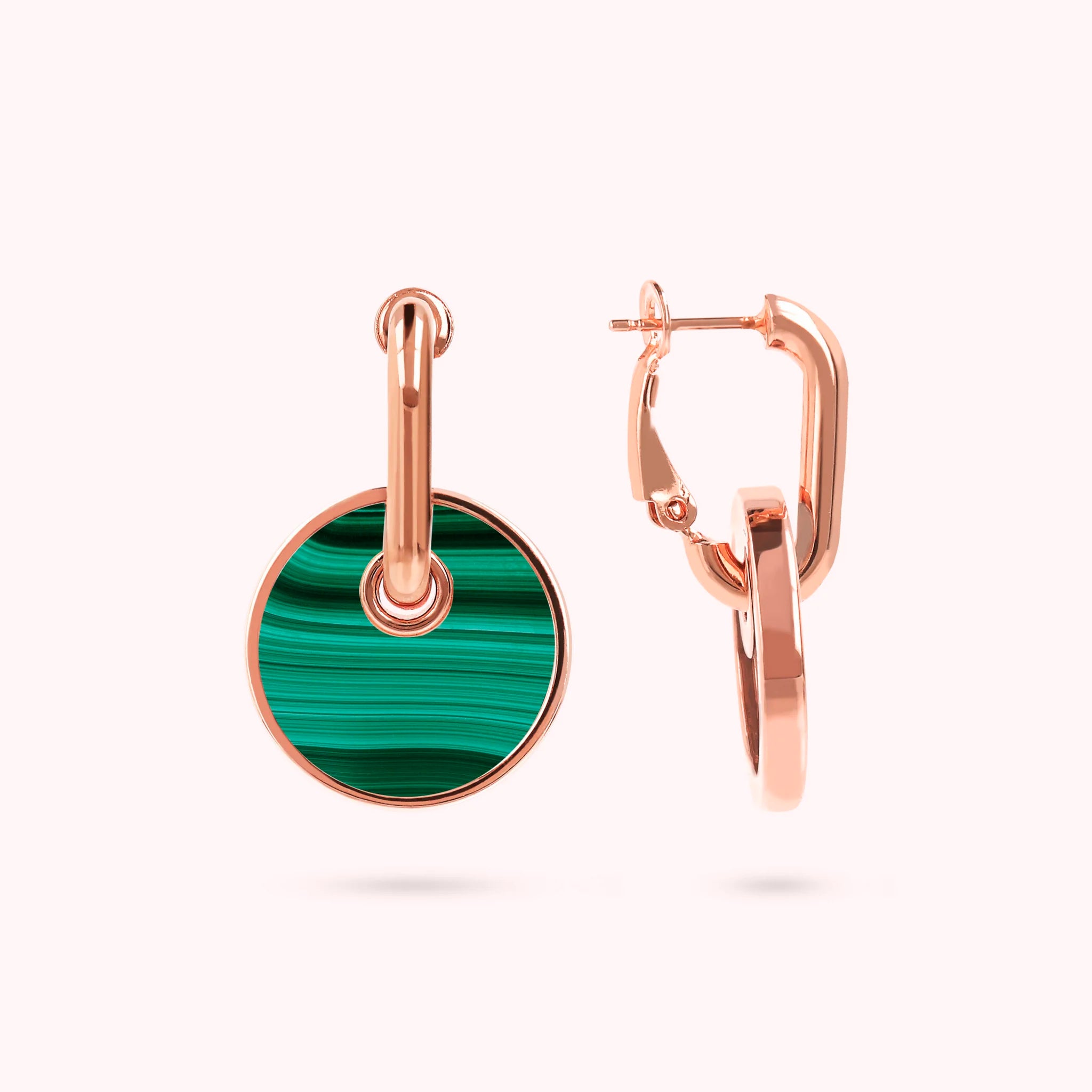 Orecchini pendenti Bronzallure realizzati in lega Golden Rosé, placcata oro rosa 18kt con pendente a bottone in pietra naturale piatta montato su base placcata oro rosa 18kt; chiusura a perno e clip.
