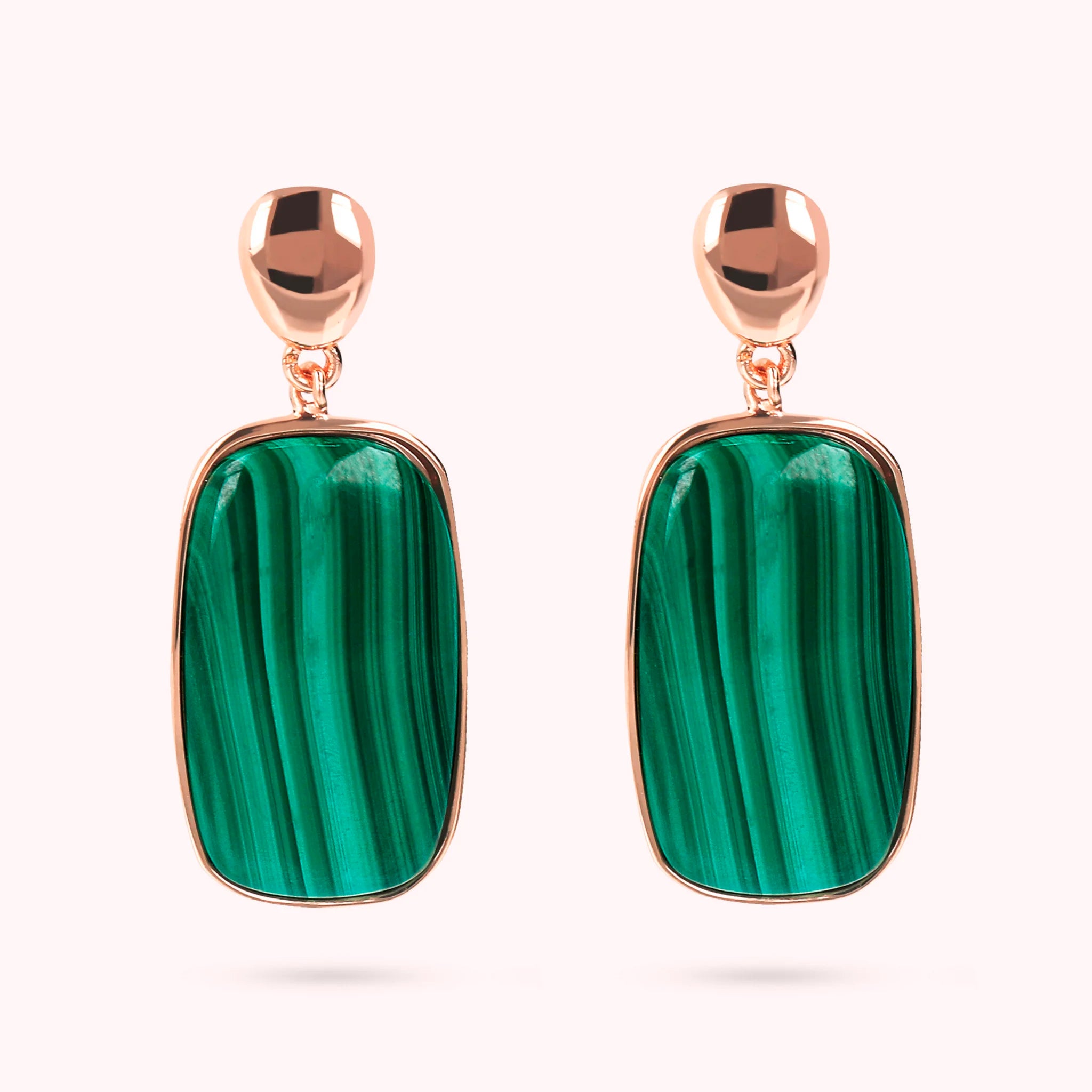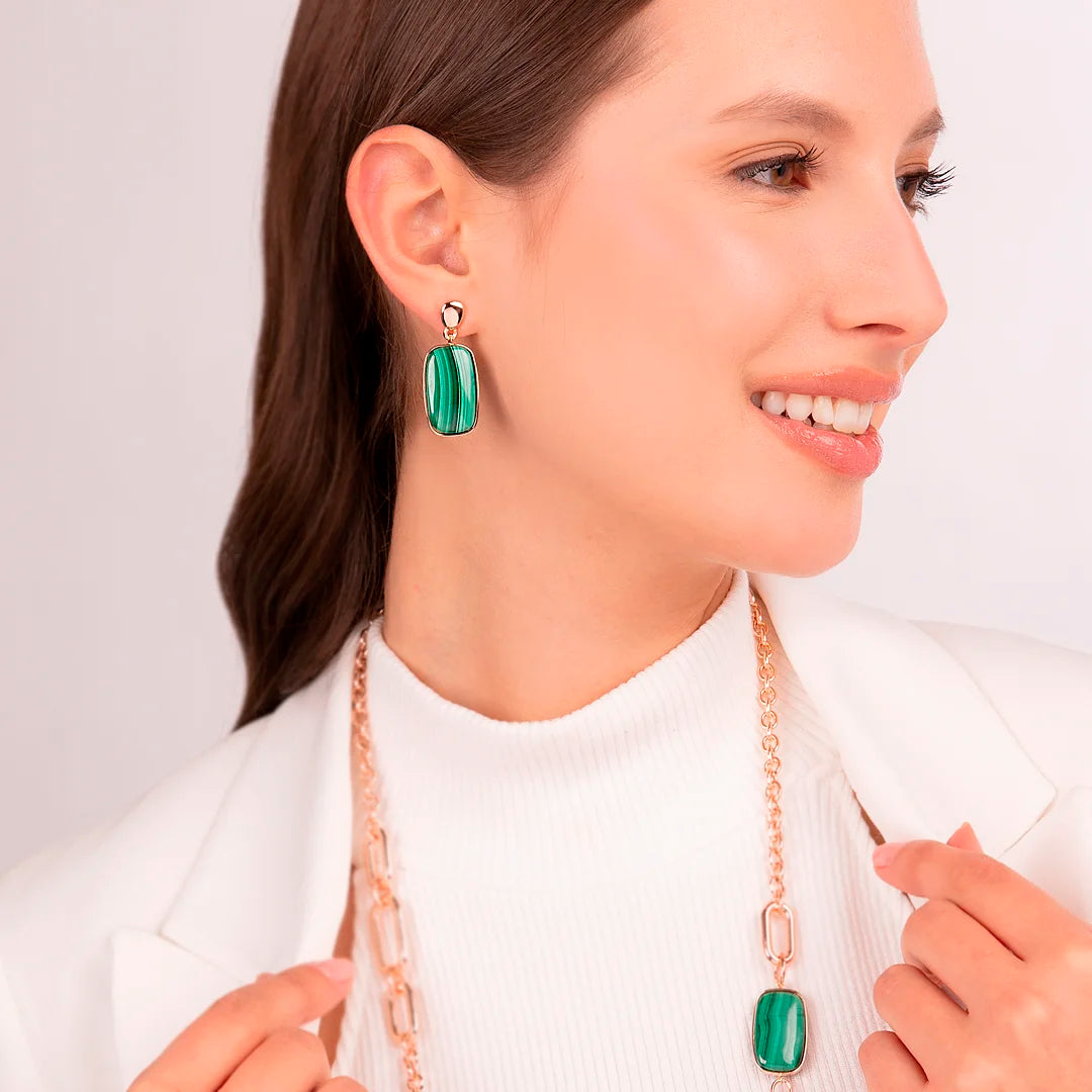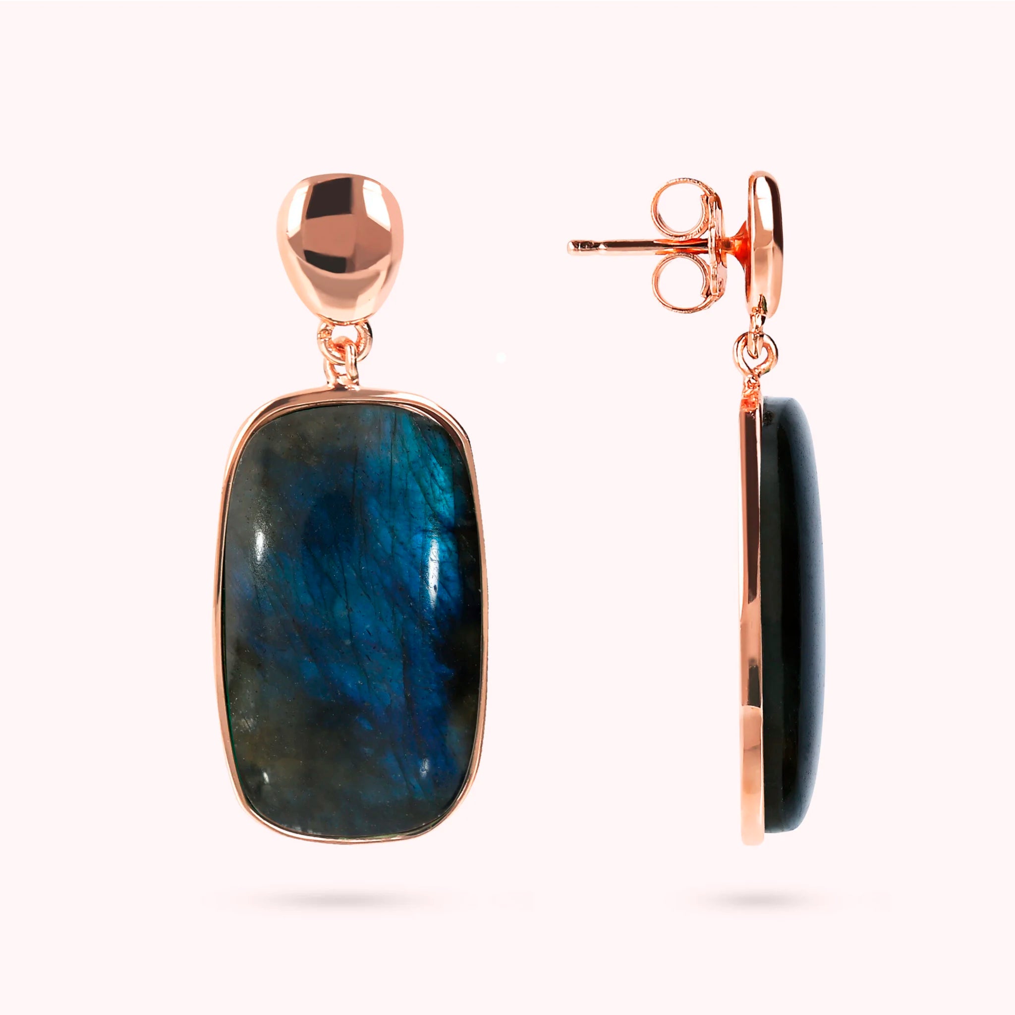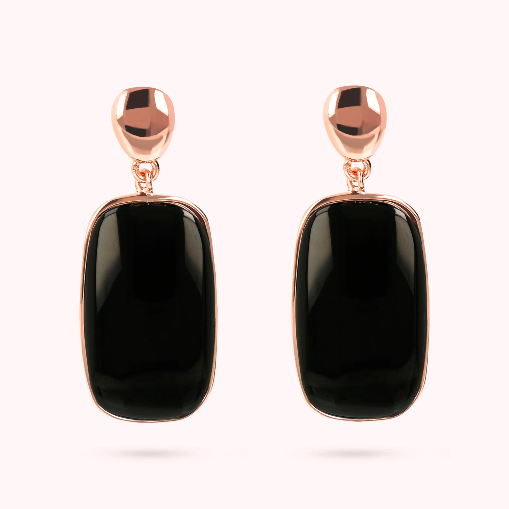 Orecchini pendenti Bronzallure realizzati in lega Golden Rosé, placcata oro rosa 18kt con pietra naturale dal taglio a saponetta (7.2x10.5 mm), con angoli smussati e linee morbide; chiusura a perno e farfalla.