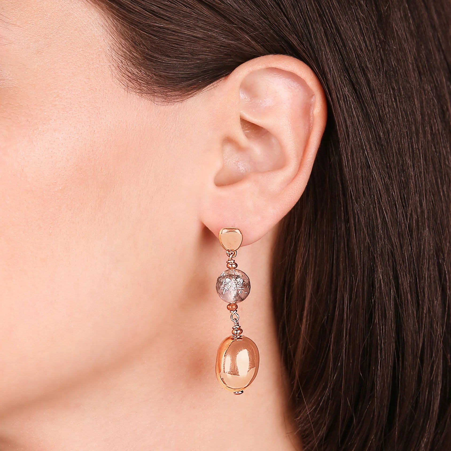 Orecchini pendenti Bronzallure realizzati in lega Golden Rosé, placcata oro rosa 18kt, composti da una piccola sfera in quarzo grigio e una pepita in golden rosé; lunghezza di 5 cm e chiusura a perno e farfalla.