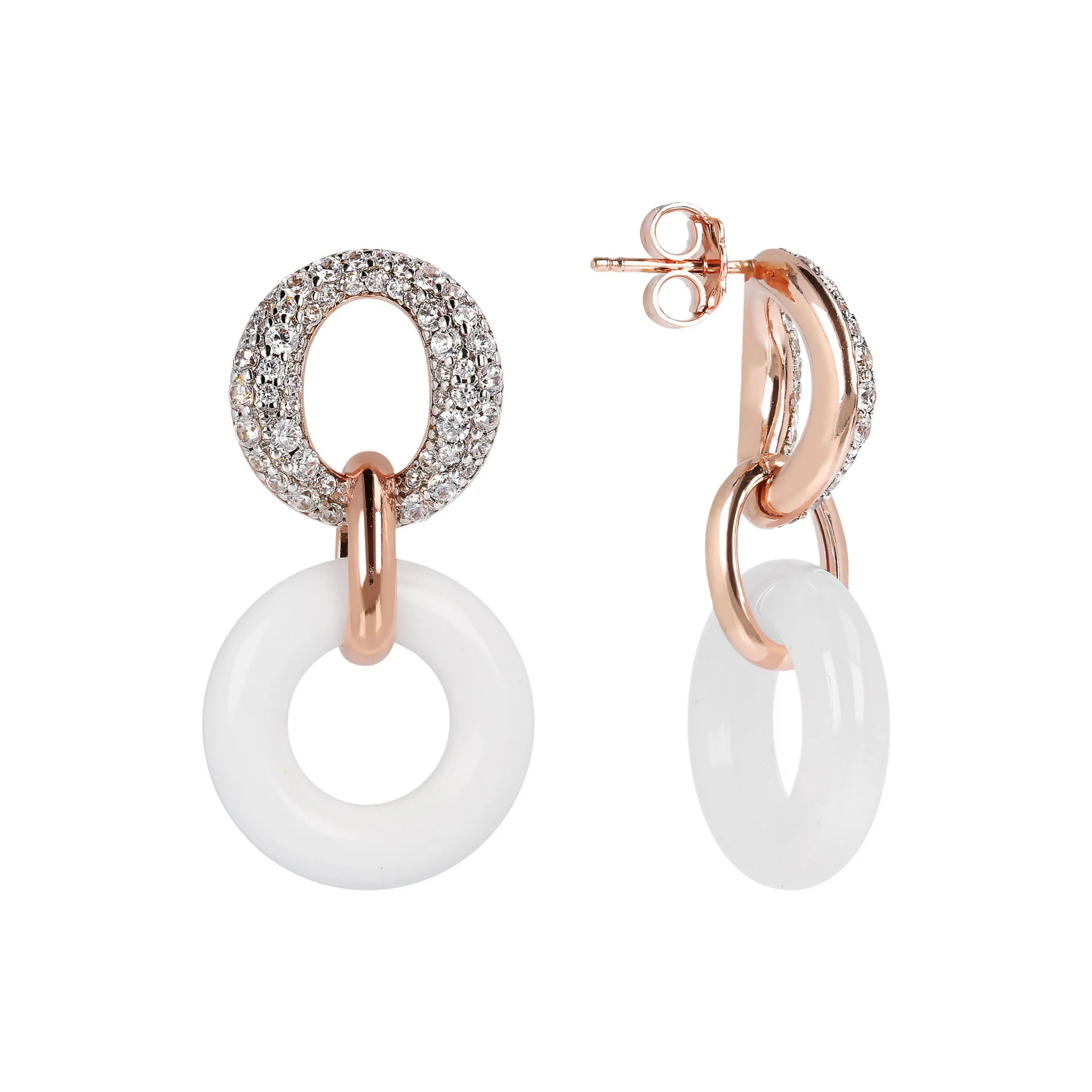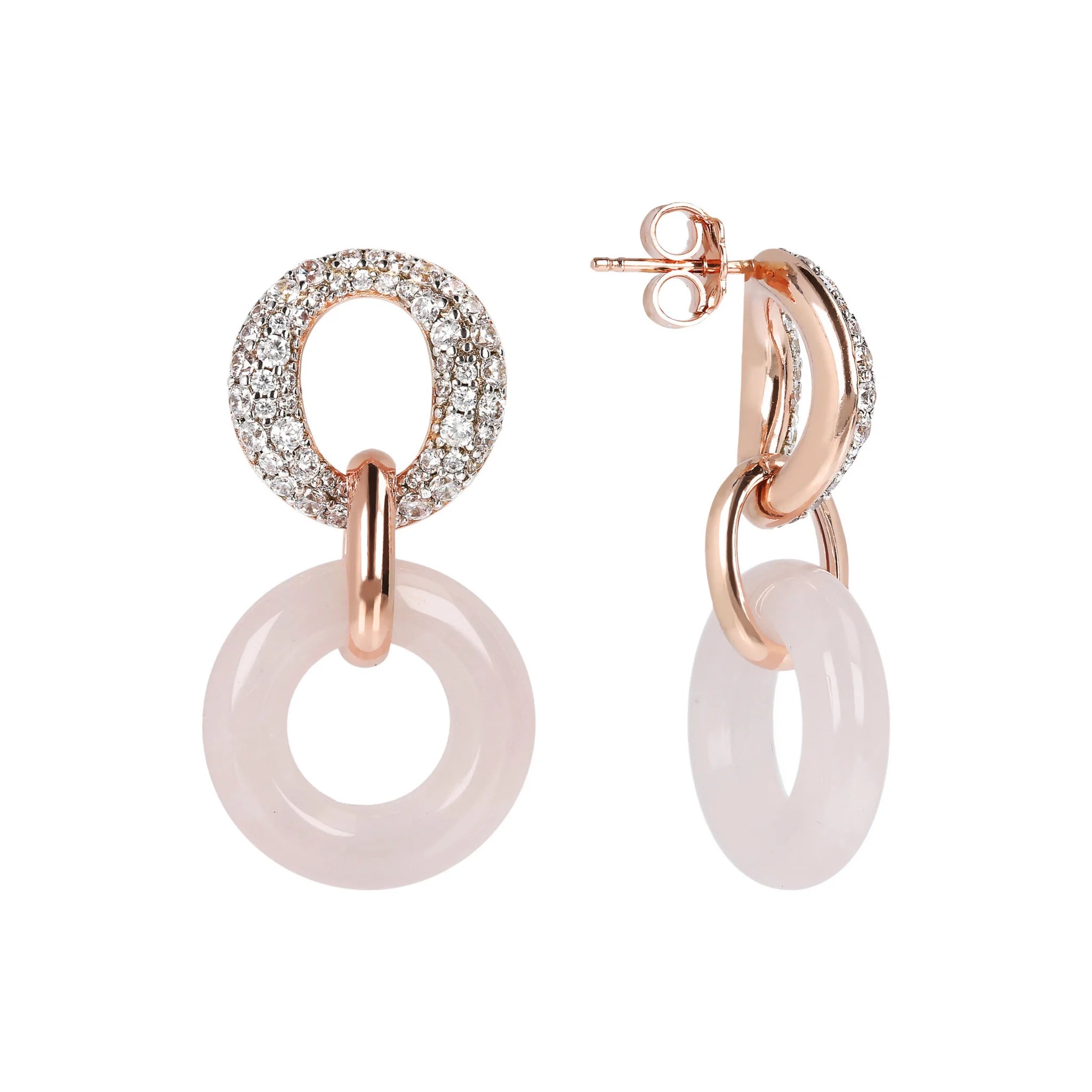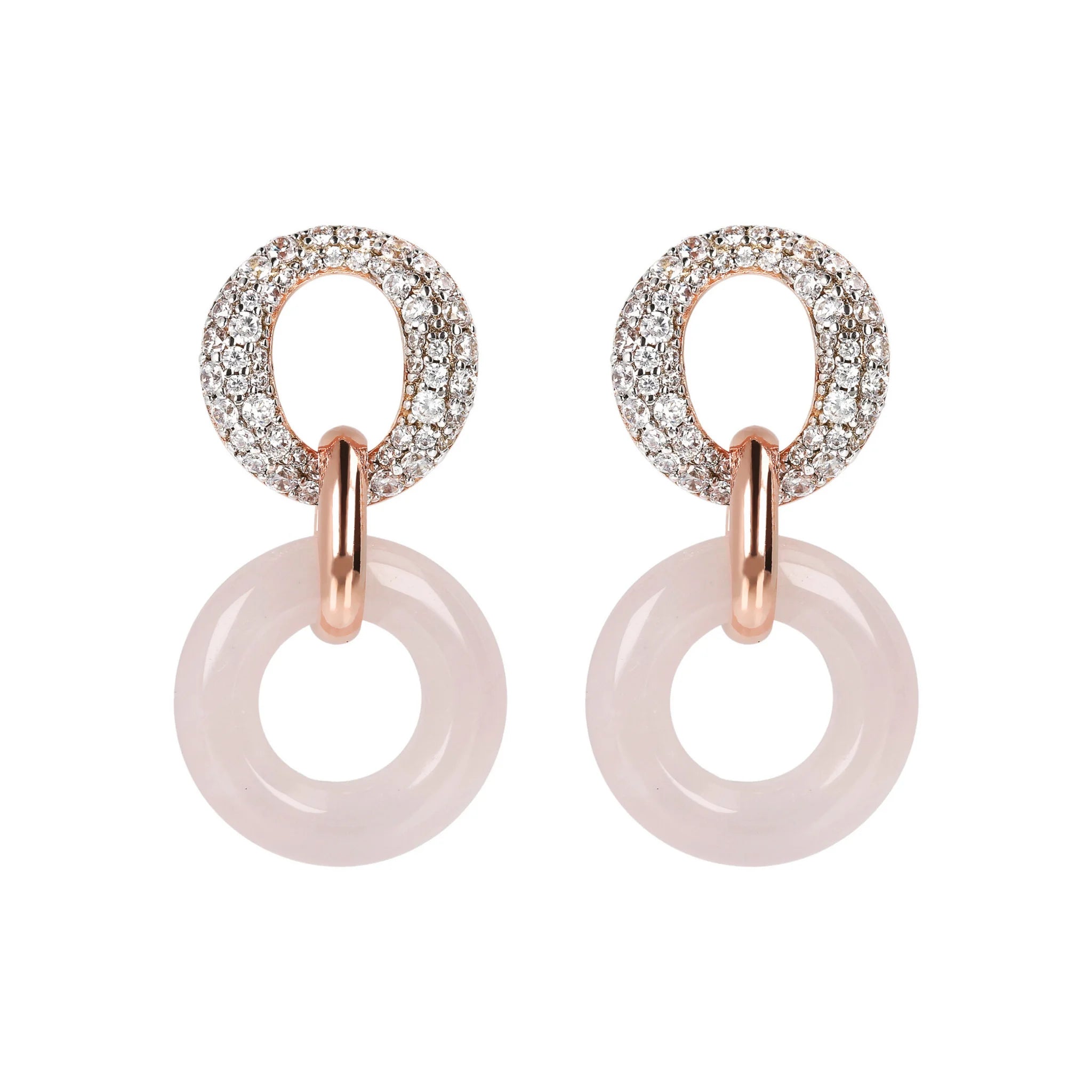 Orecchini pendenti Bronzallure, realizzati in lega Golden Rosé, placcati oro rosa 18kt, impreziositi da due anelli pavé in cubic zirconia, qualità luminosa, e da due pietre naturali ad anello (20 mm); lunghezza 3.7 cm; chiusura a perno e farfalla.