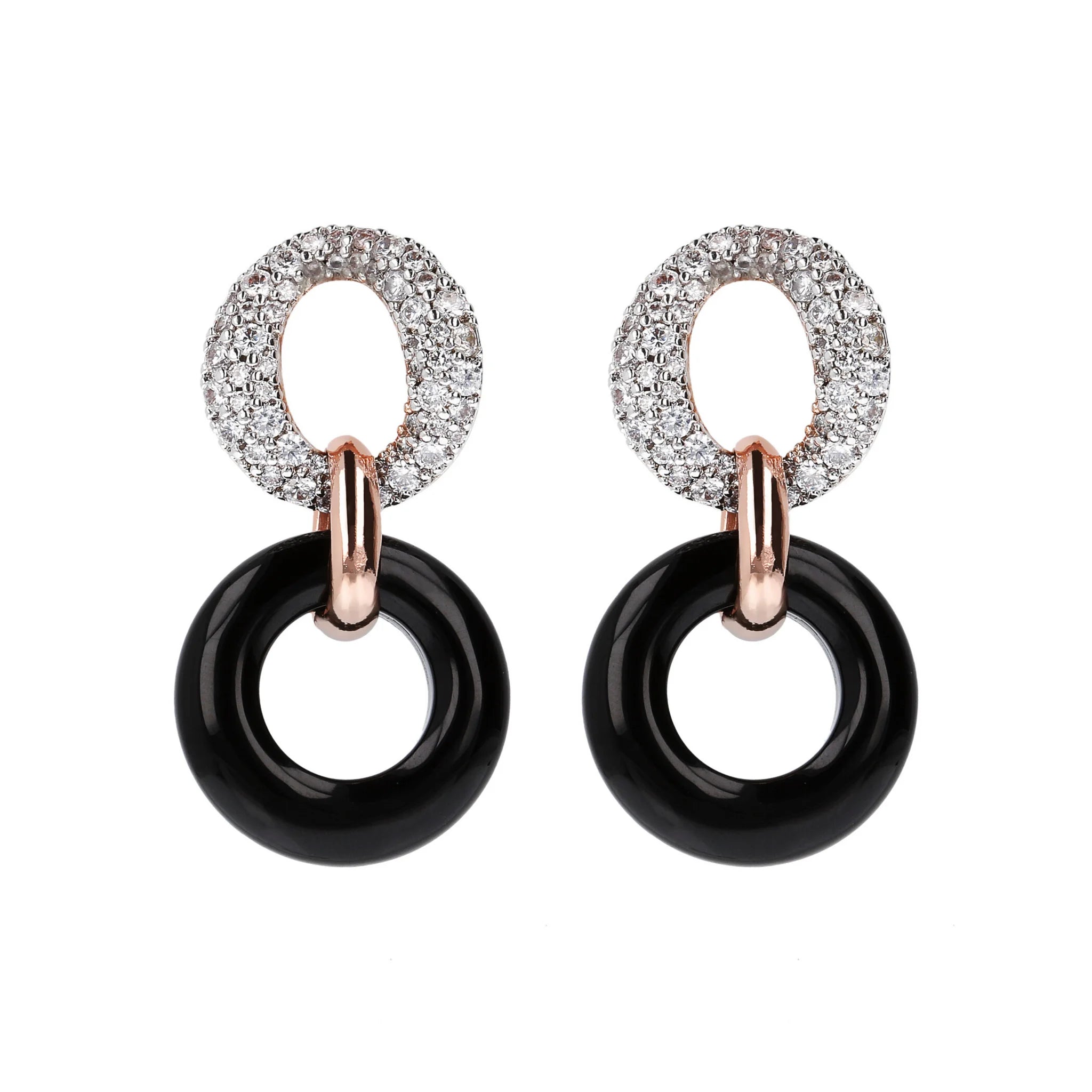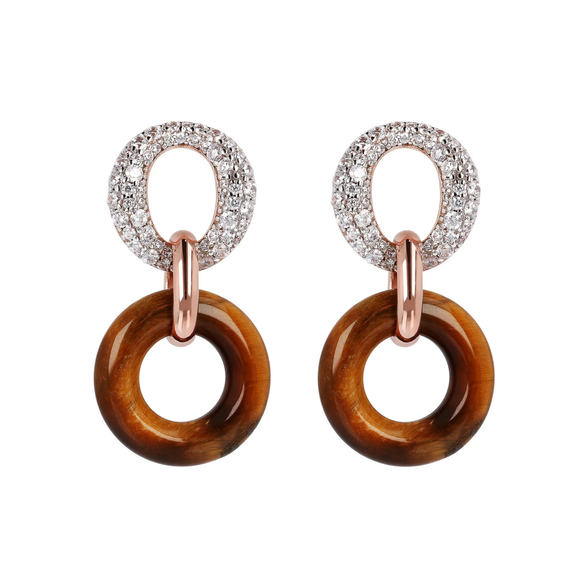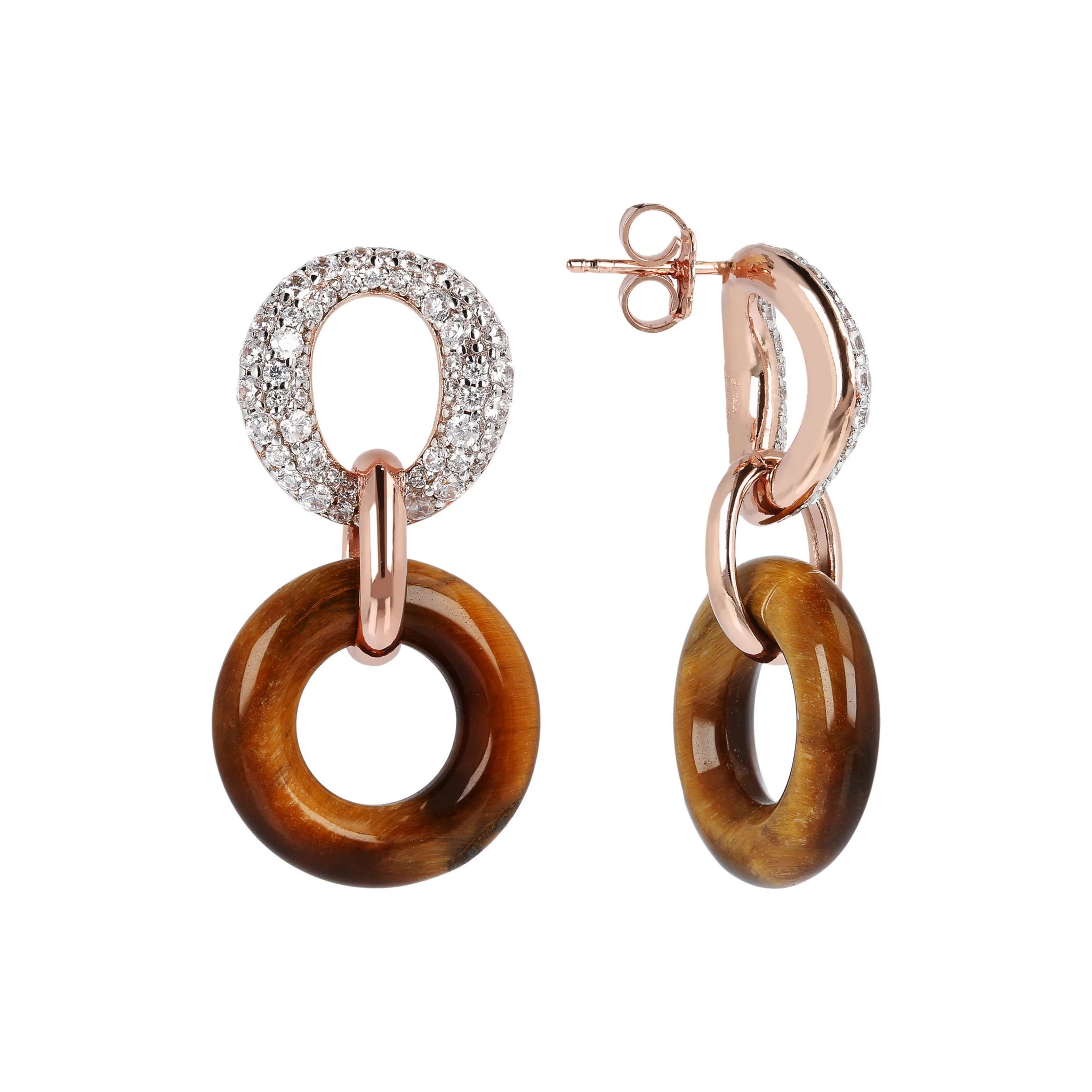 Orecchini pendenti Bronzallure, realizzati in lega Golden Rosé, placcati oro rosa 18kt, impreziositi da due anelli pavé in cubic zirconia, qualità luminosa, e da due pietre naturali ad anello (20 mm); lunghezza 3.7 cm; chiusura a perno e farfalla.