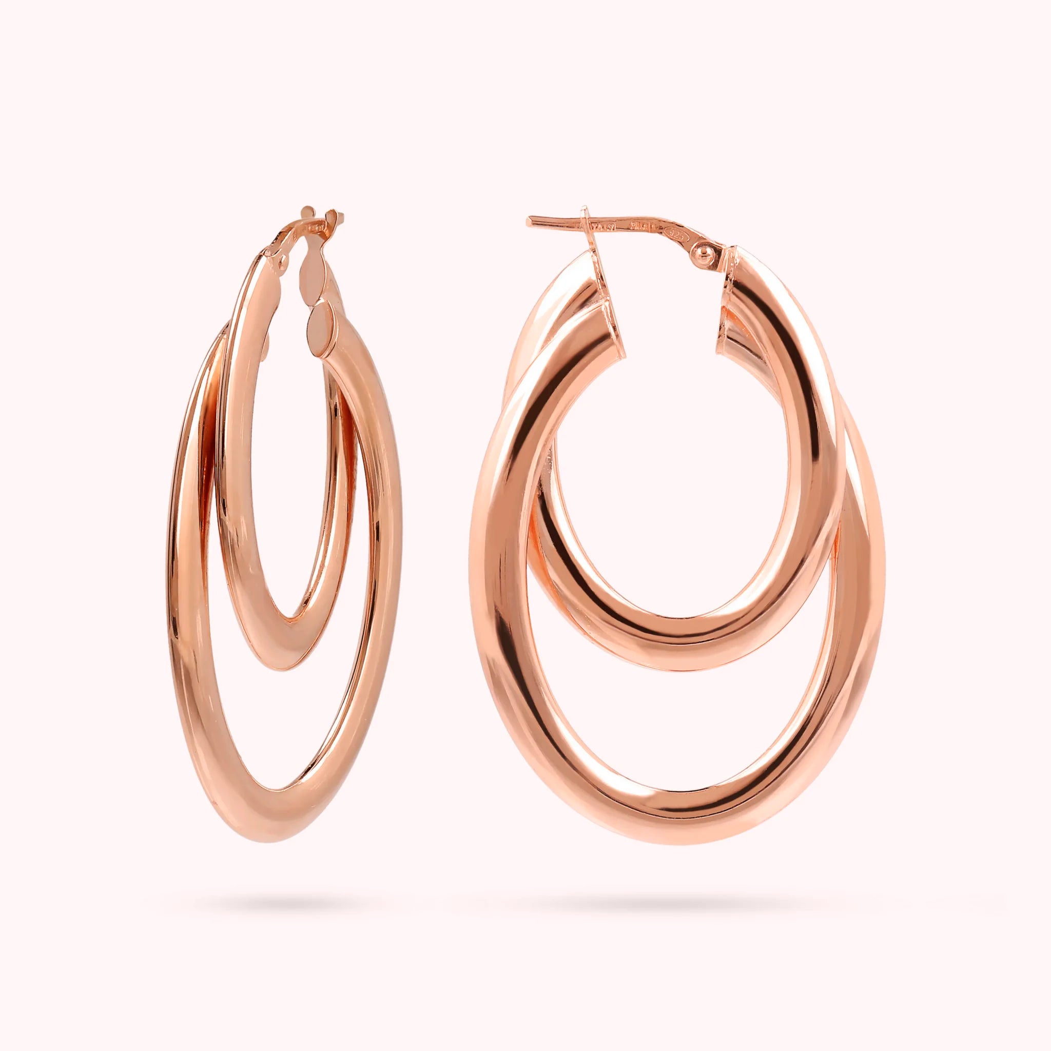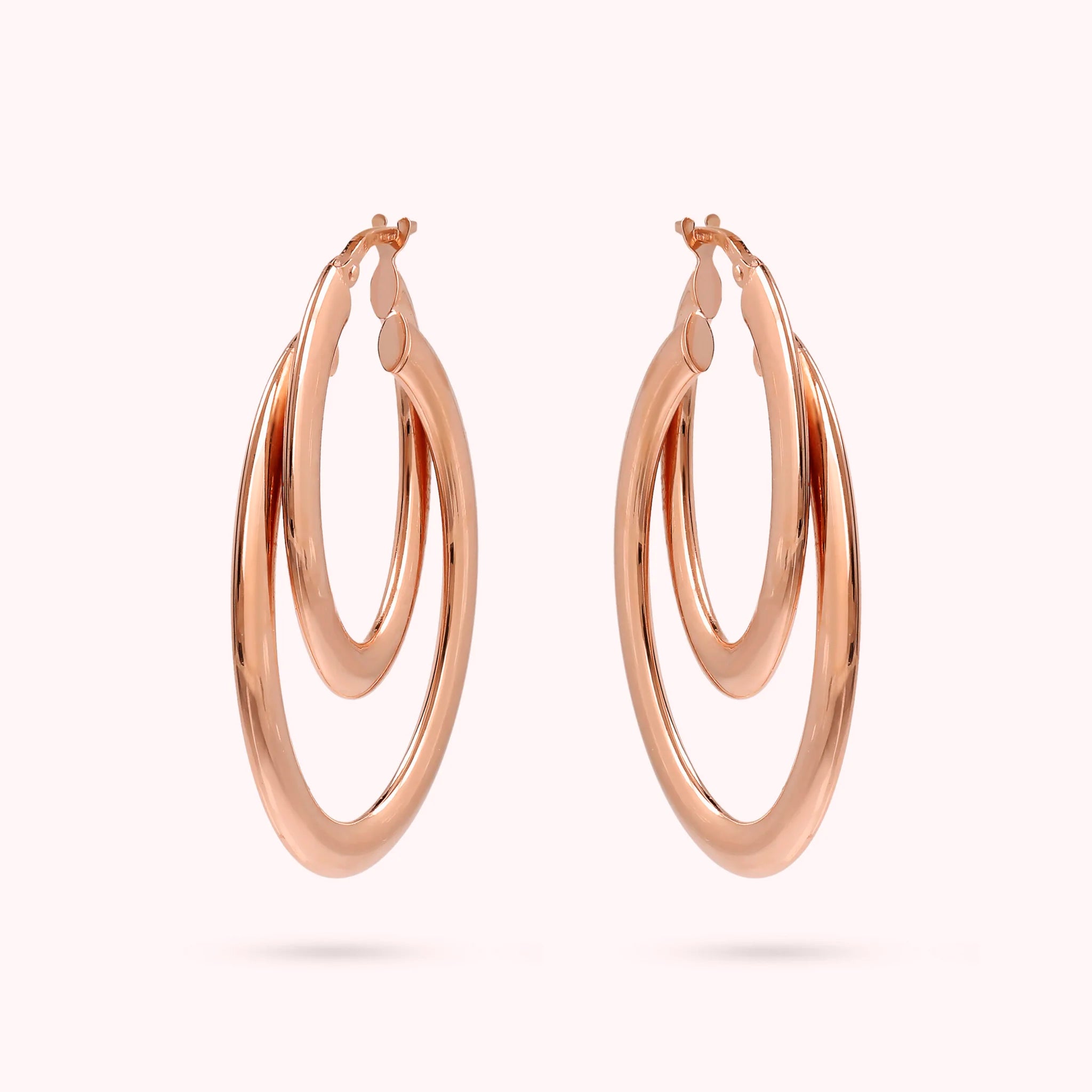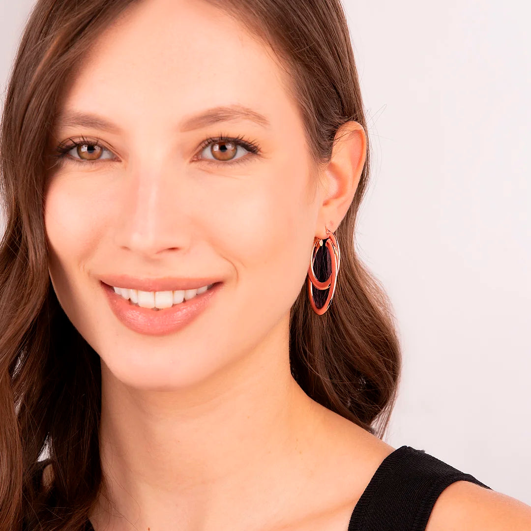 Orecchini pendenti a cerchio Bronzallure realizzati in lega Golden Rosé, placcati oro rosa 18kt, con doppio cerchio graduato; chiusura a baionetta. Dimensioni: 40x28 mm.