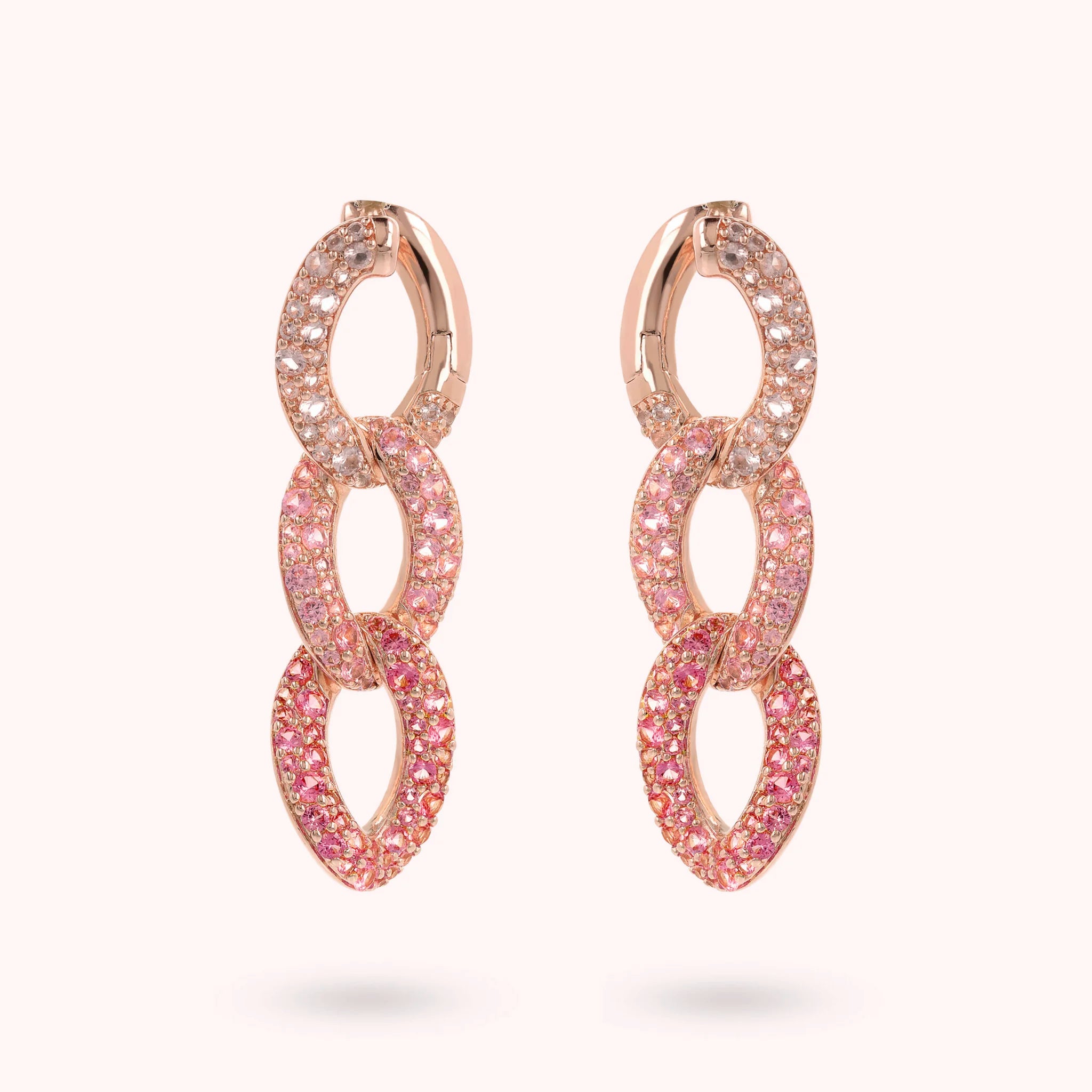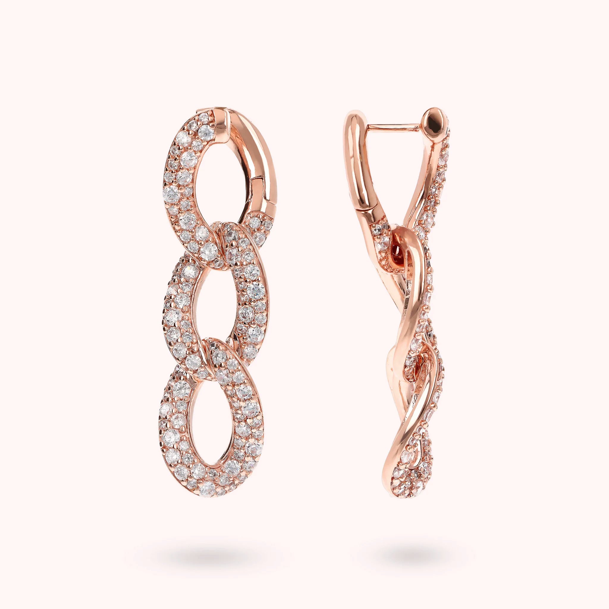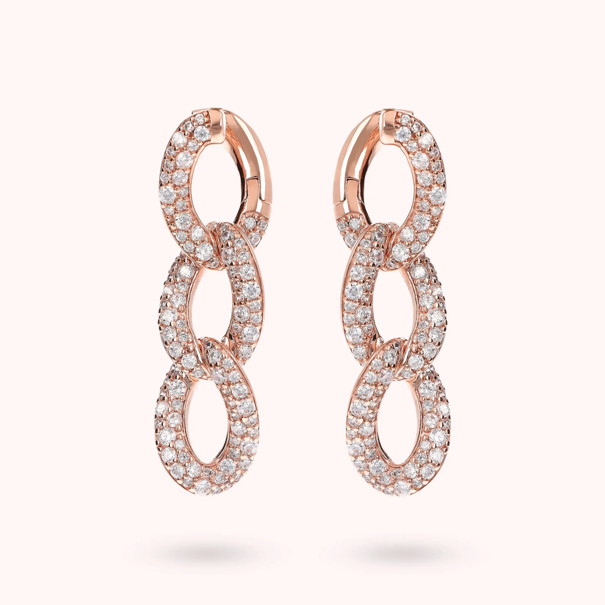 Orecchini pendenti Bronzallure realizzati in lega Golden Rosé, placcata Oro rosa 18kt, con catena grumetta squadrata e superficie pavé in cubic zirconia, qualità luminosa. Chiusura con perno a incastro.