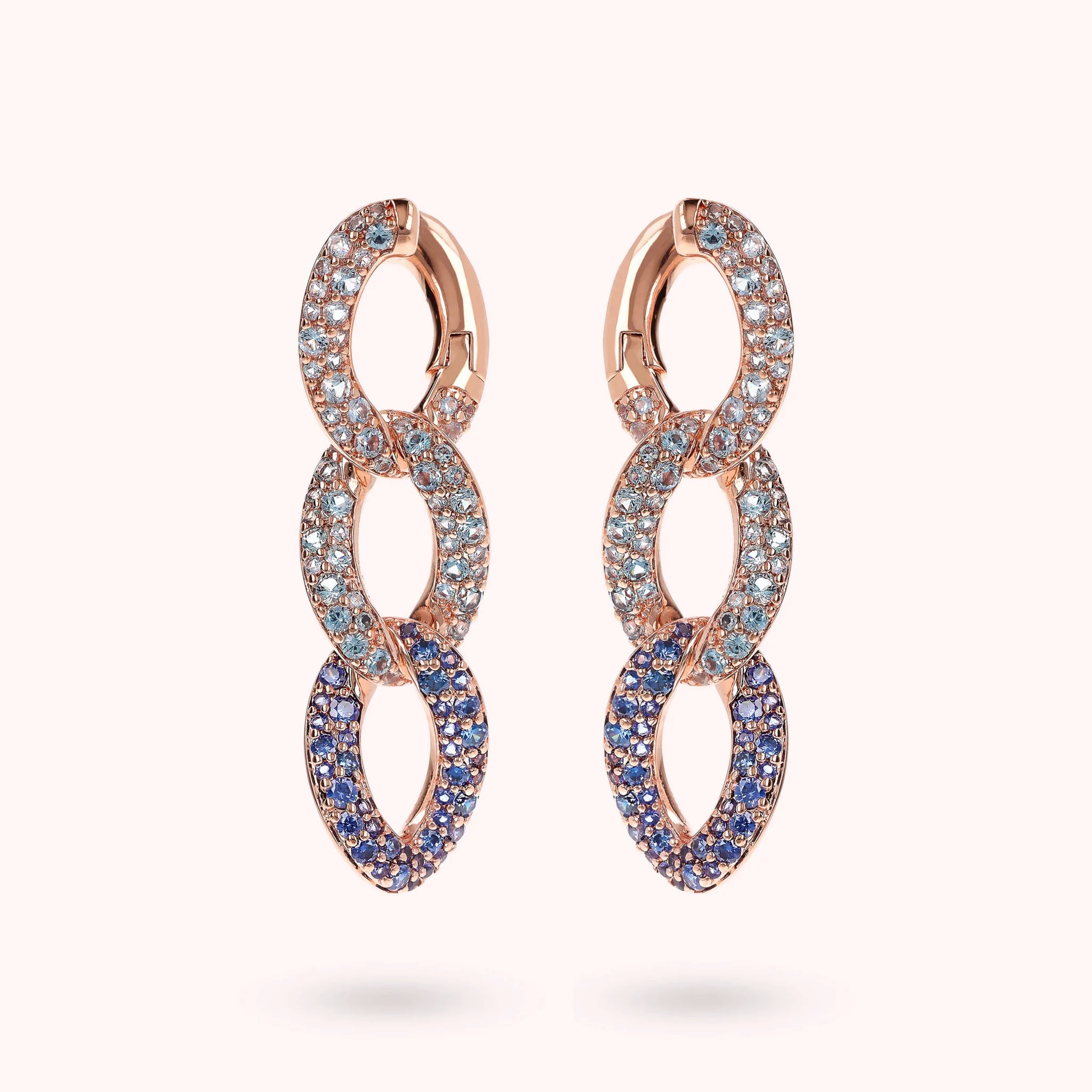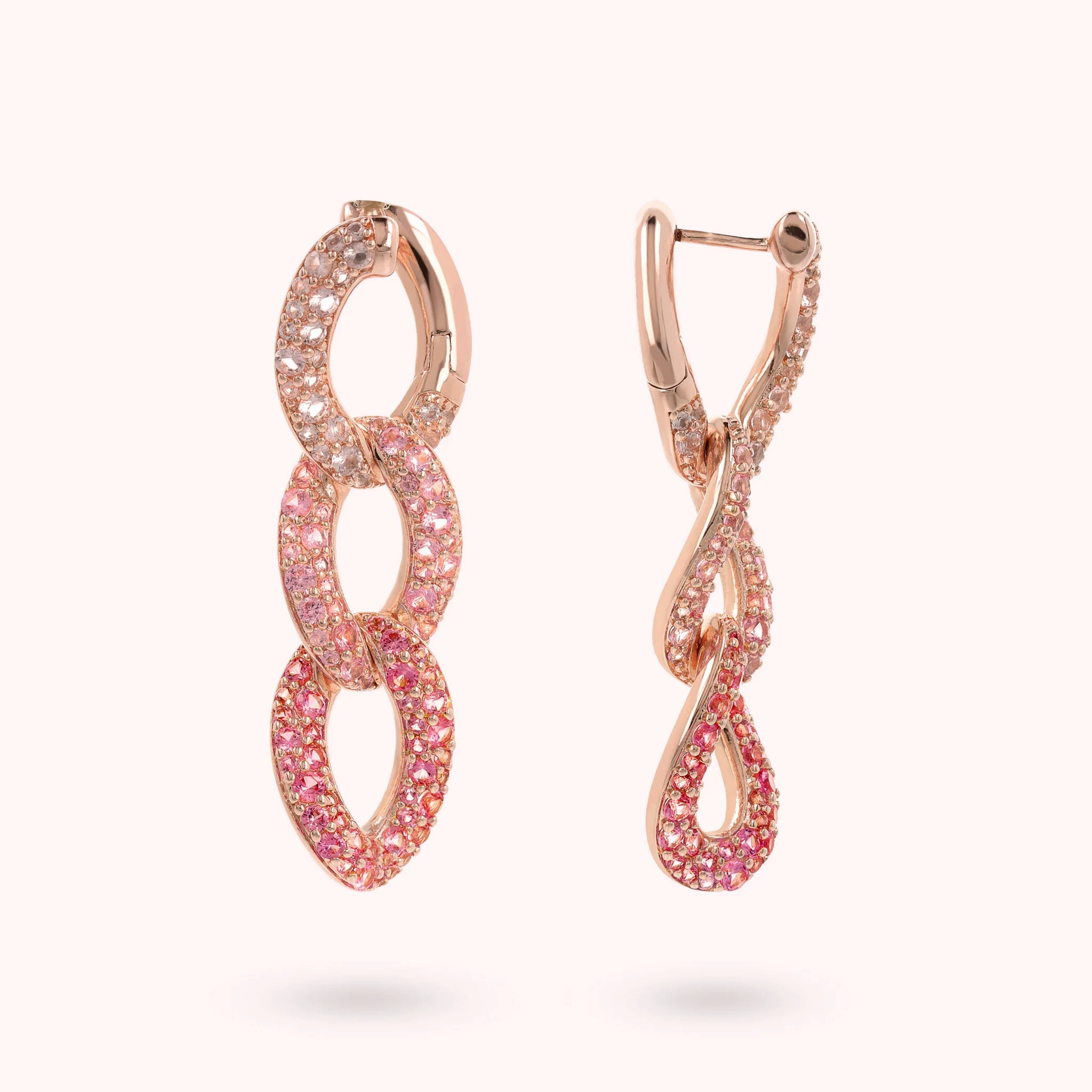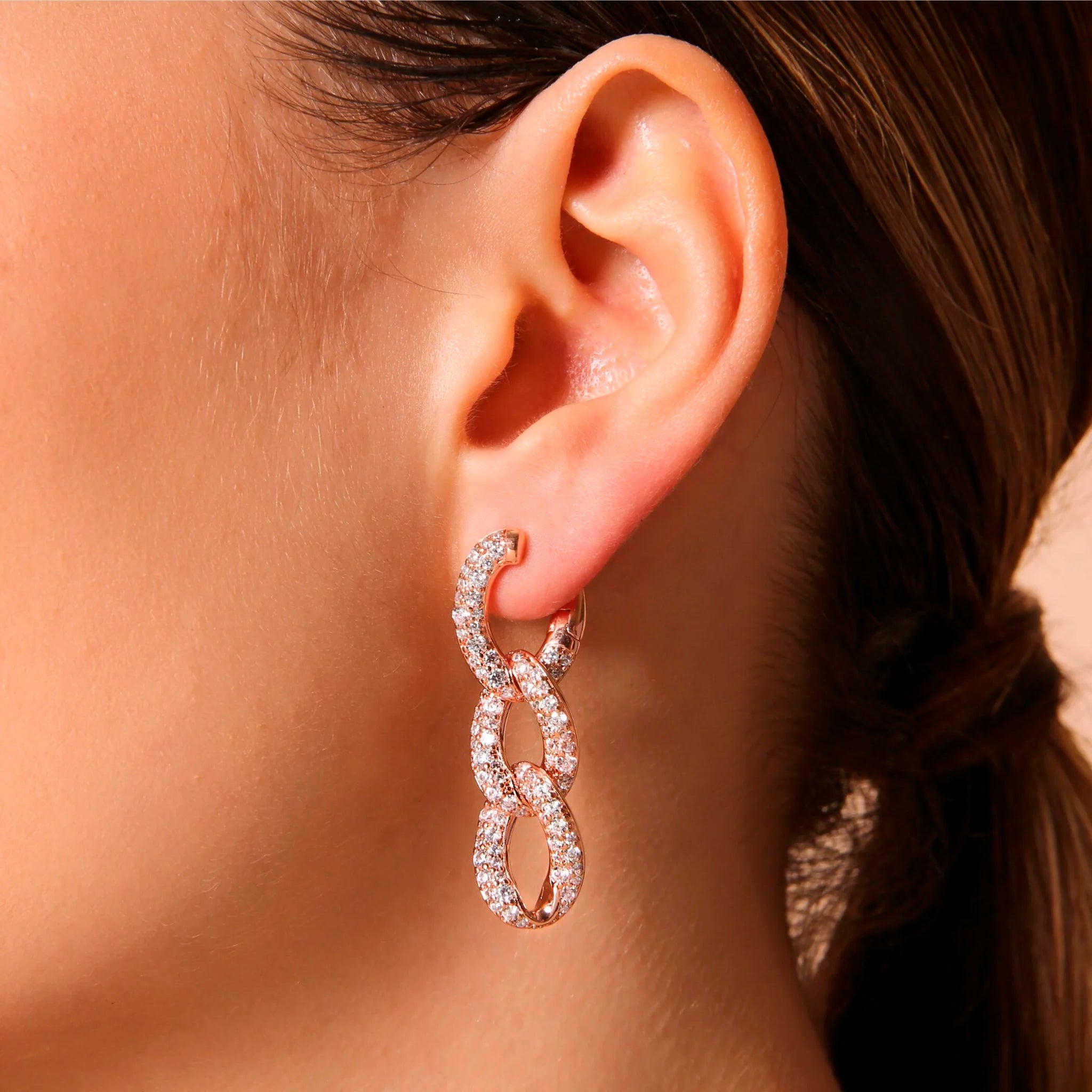 Orecchini pendenti Bronzallure realizzati in lega Golden Rosé, placcata Oro rosa 18kt, con catena grumetta squadrata e superficie pavé in cubic zirconia, qualità luminosa. Chiusura con perno a incastro.