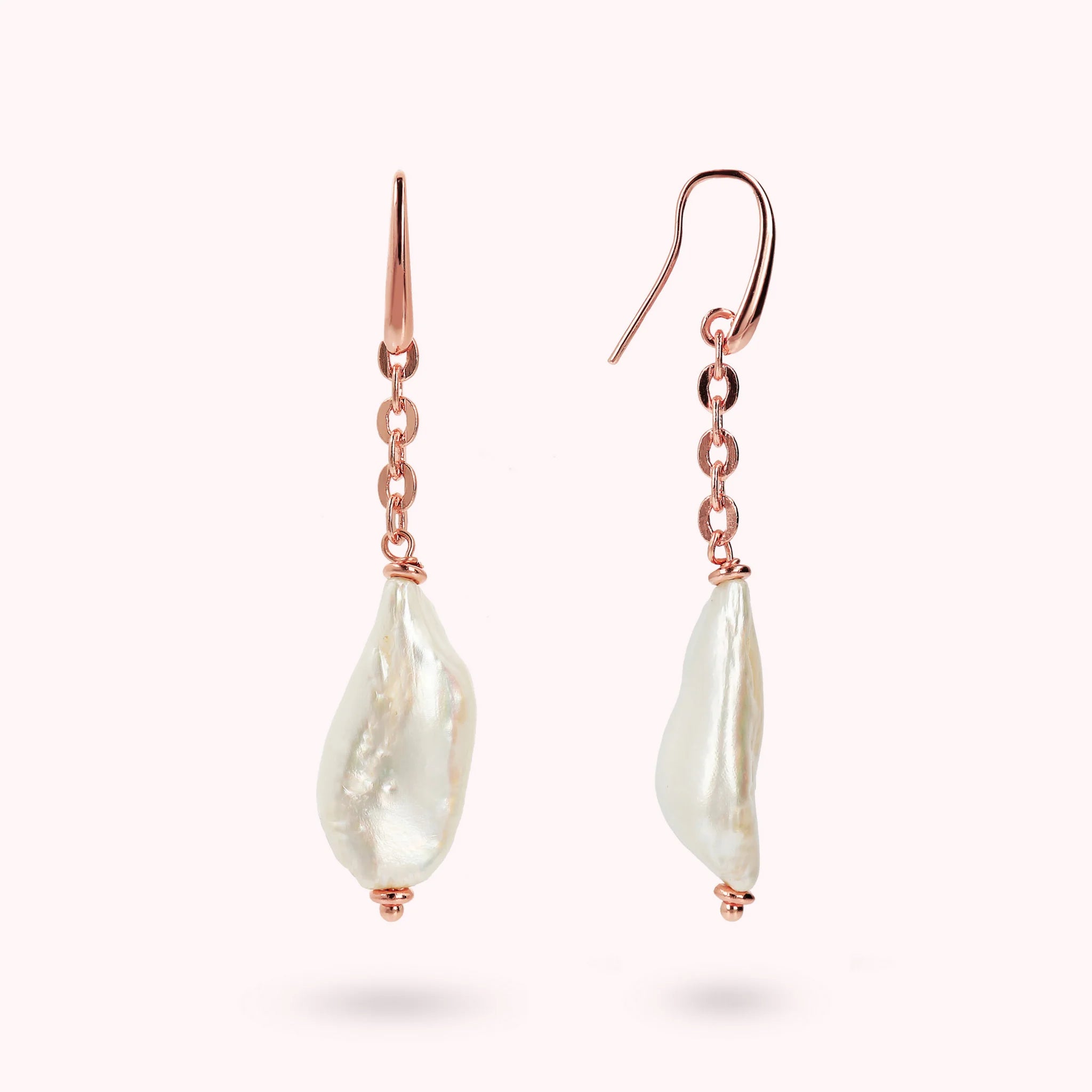 Orecchini pendenti Bronzallure realizzati in lega Golden Rosé, placcata oro rosa 18kt, impreziositi da catena rolo e da perle Barocche coltivate d'acqua dolce bianche dalla forma irregolare, chiusura ad amo.