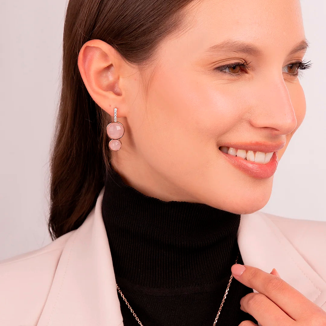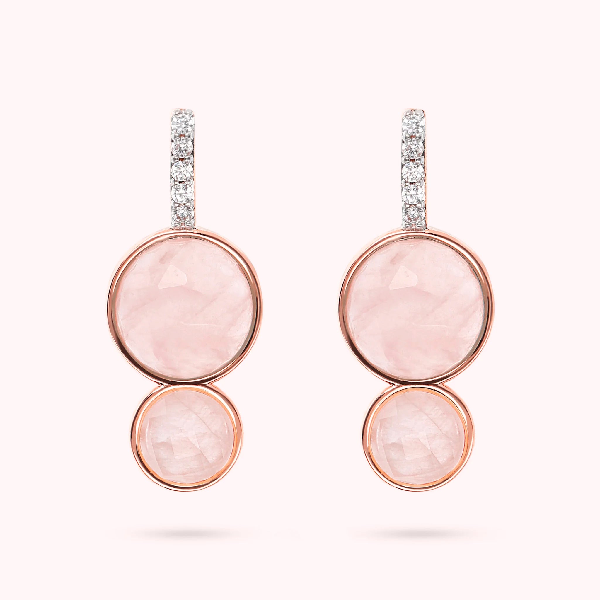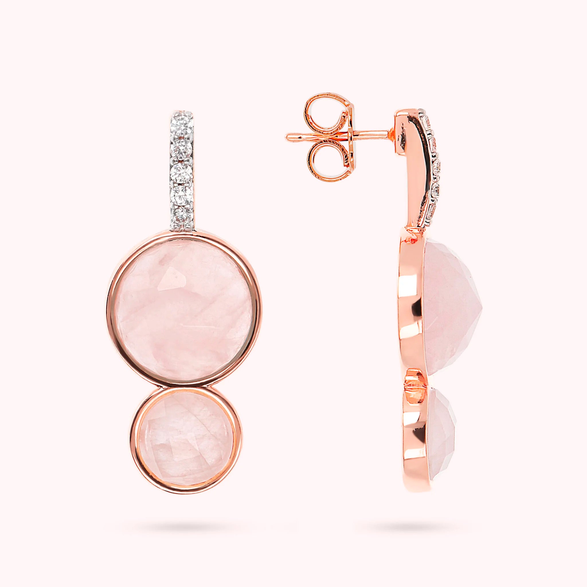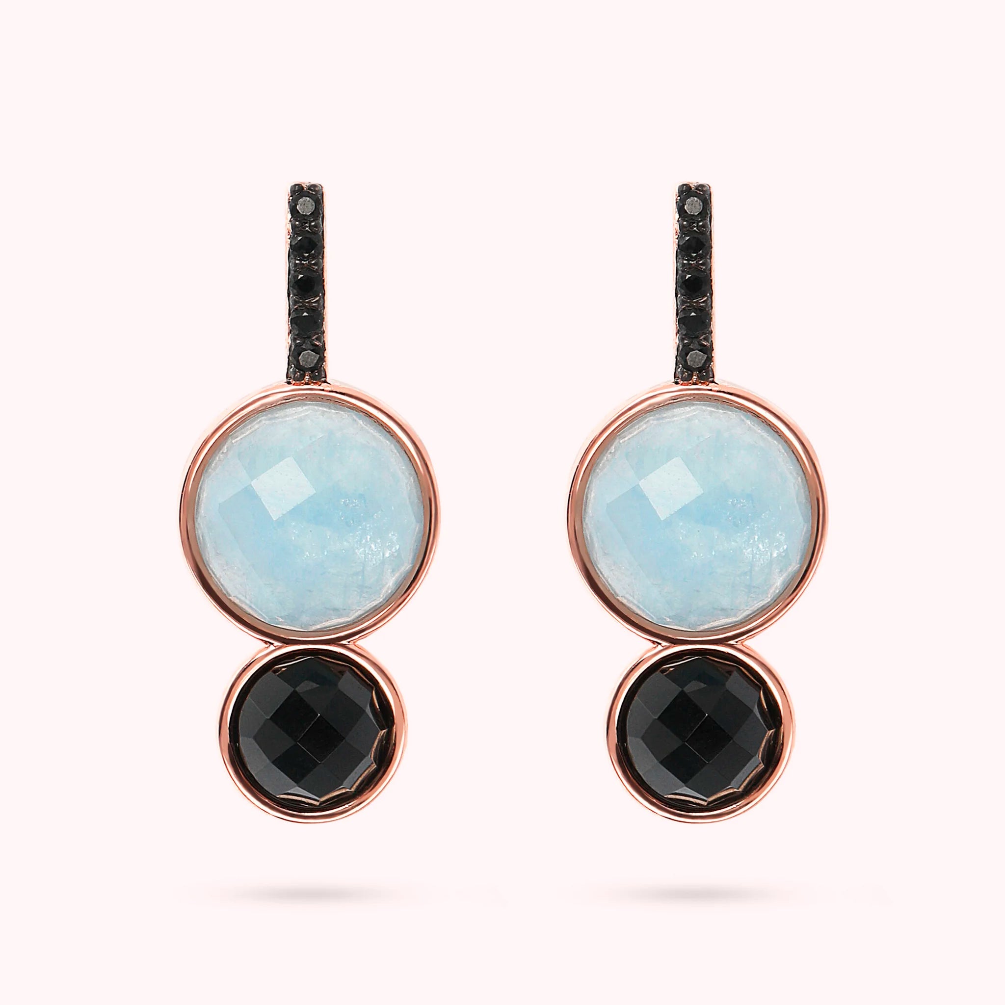 Orecchini pendenti Bronzallure, realizzati in lega Golden Rosé, placcati oro rosa 18kt, composti da una parte superiore in cubic zirconia o spinello nero e da un tondo piccolo (8 mm) e uno grande (12 mm) in pietra naturale acquamarina e onice nero o quarzo rosa; chiusura a perno e farfalla.