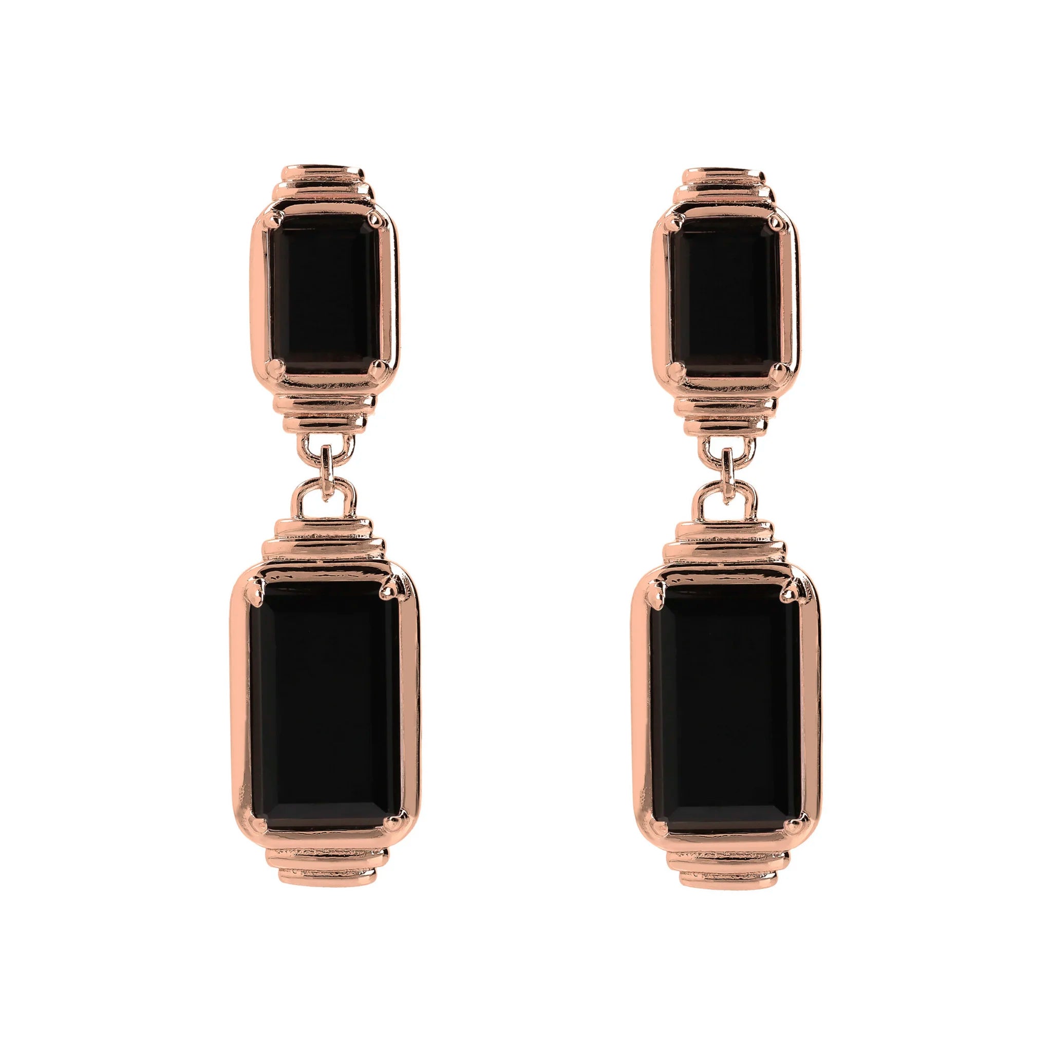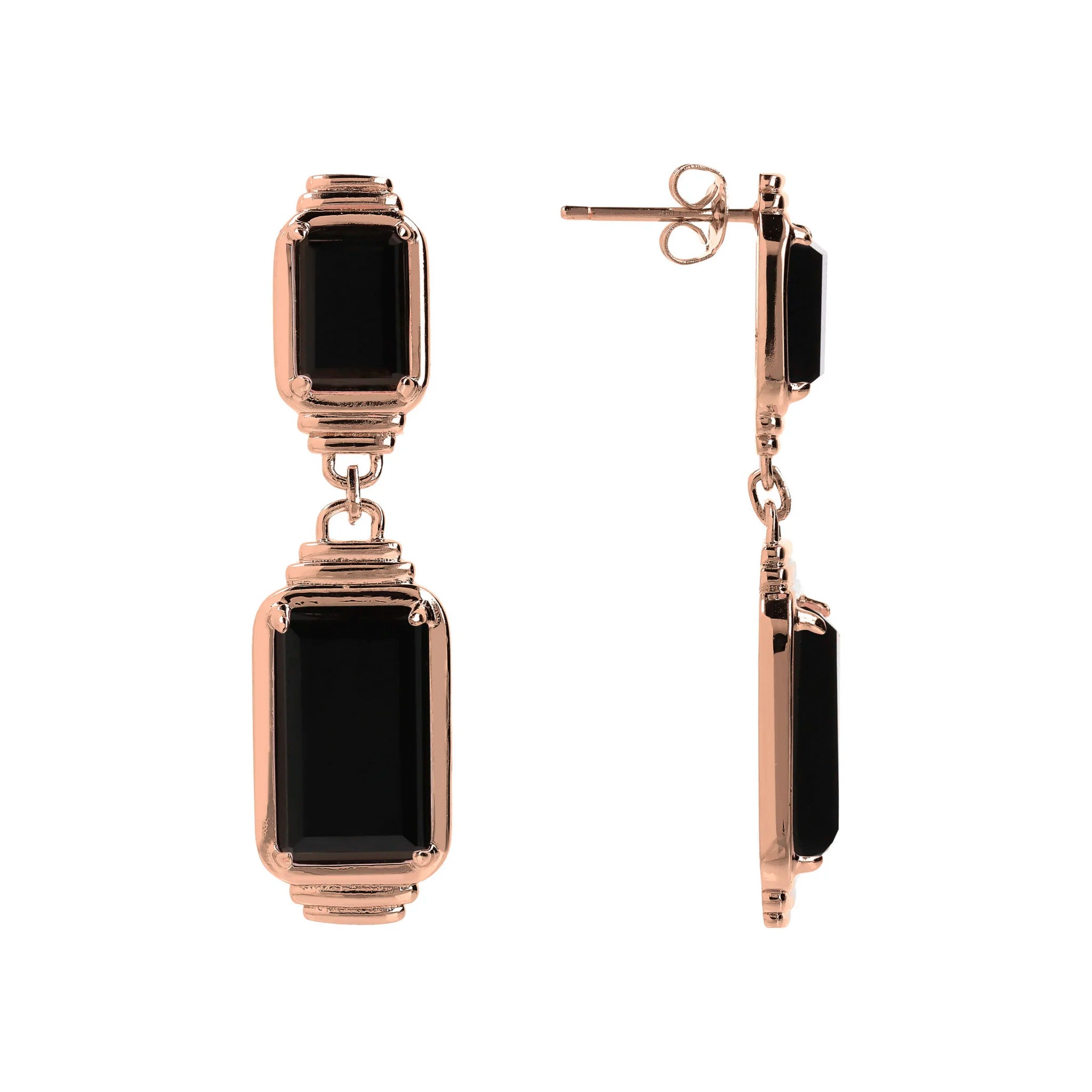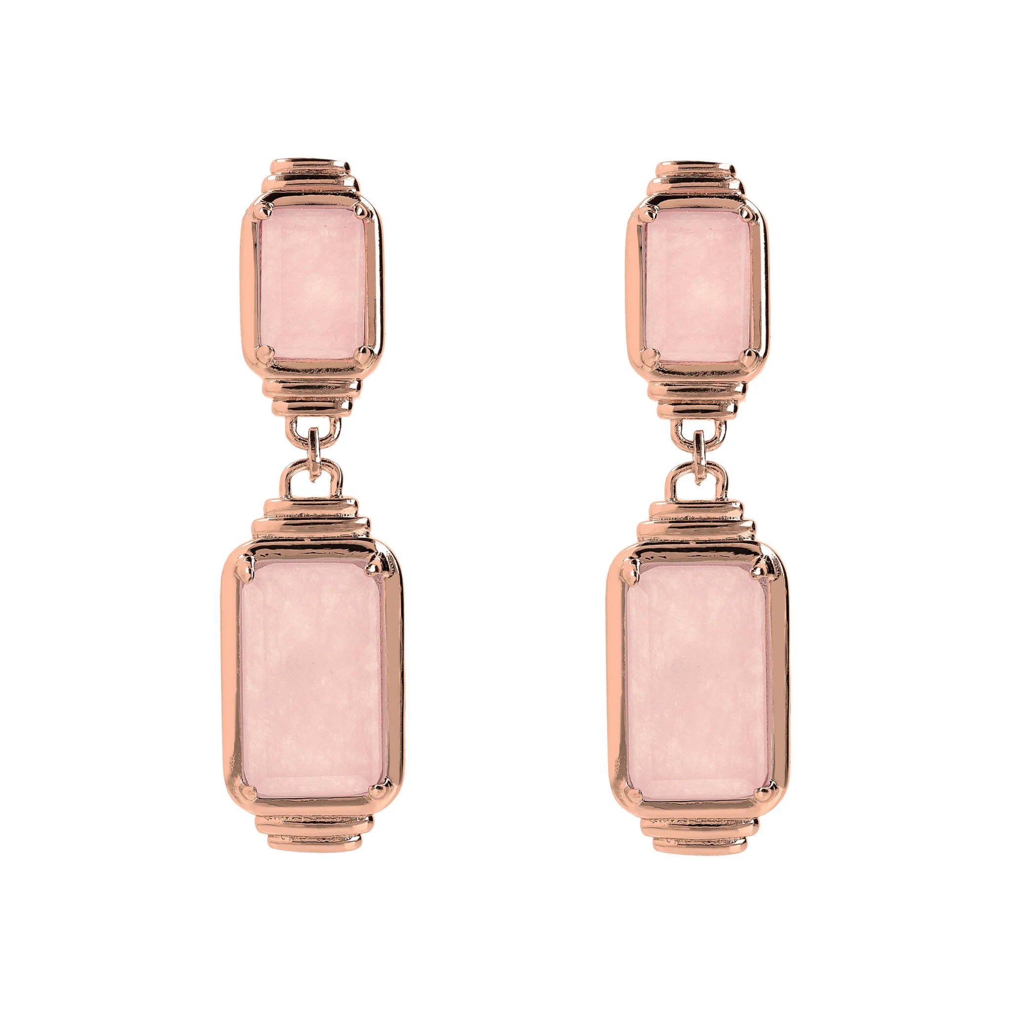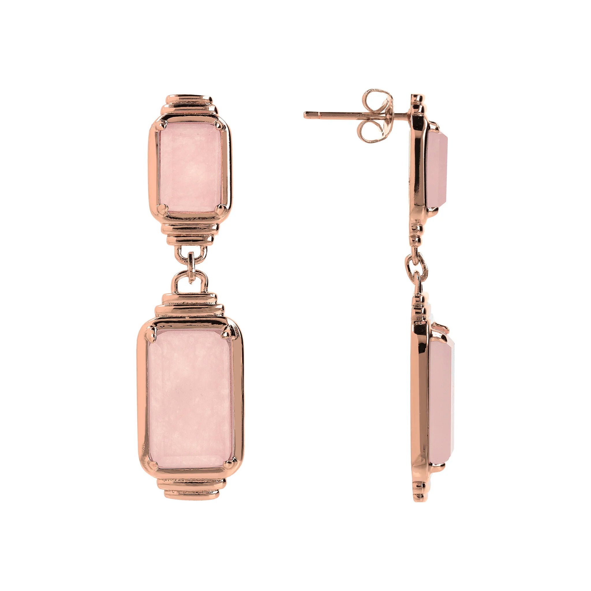 Orecchini pendenti Bronzallure realizzati in lega Golden Rosé, placcata oro rosa 18kt, impreziositi da castoni elaborati sui quali sono posizionate delle pietre naturali rettangolari piccole (8.8x6 mm) e grandi (8.5x14.5 mm) dal taglio smeraldo; chiusura a perno e farfalla.
