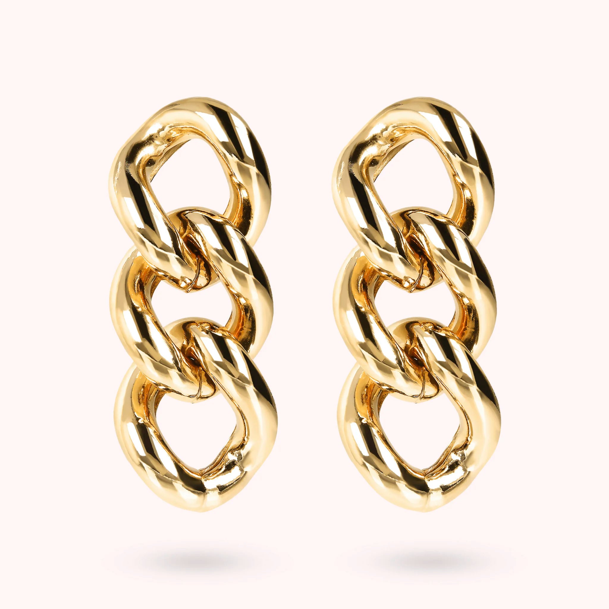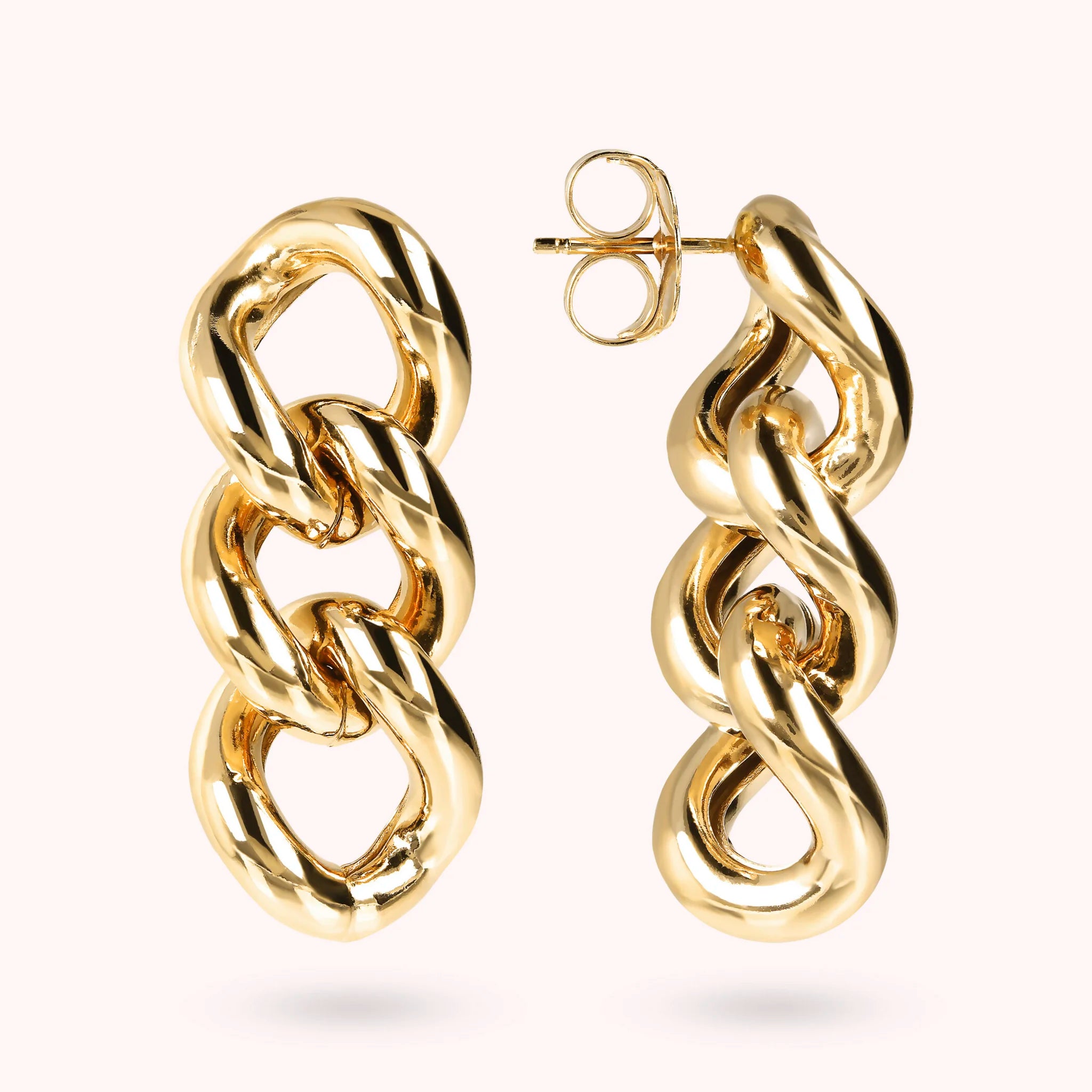 Orecchini pendenti Bronzallure realizzati in lega Golden Rosé, placcati oro giallo 18kt con tre maglie grumetta; chiusura a perno e farfalla.