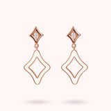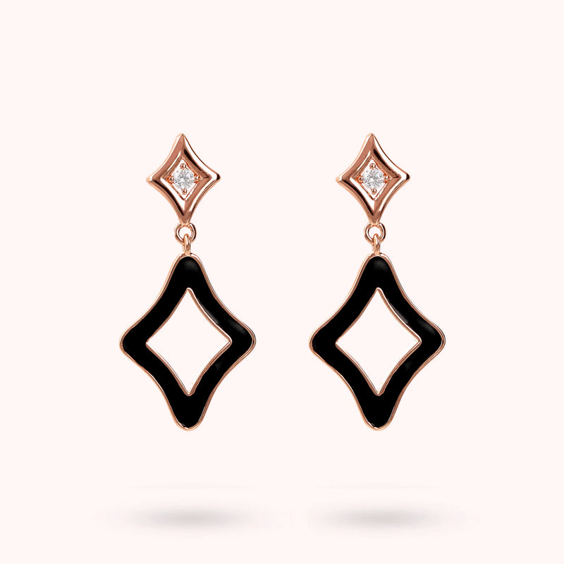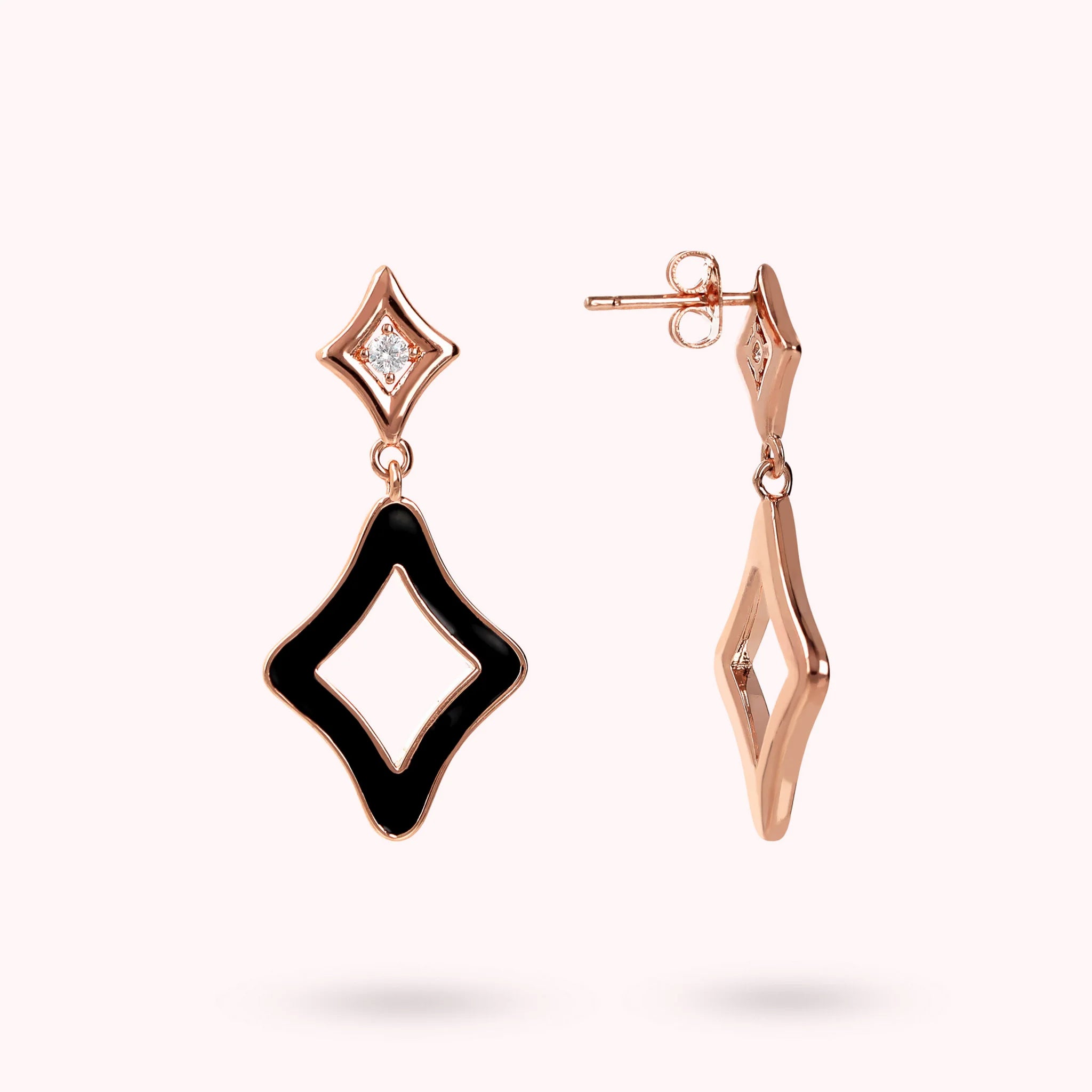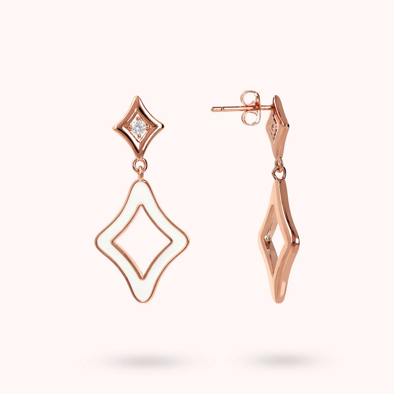 Orecchini pendenti Bronzallure realizzati in lega Golden Rosé, placcata Oro rosa 18kt, con piccola contro-magilia étoile impreziosita da un punto luce in cubic zirconia dalla quale pendono due étoile traforate con superficie smaltata. Lunghezza 3.5 cm. Chiusura a perno e farfalla.